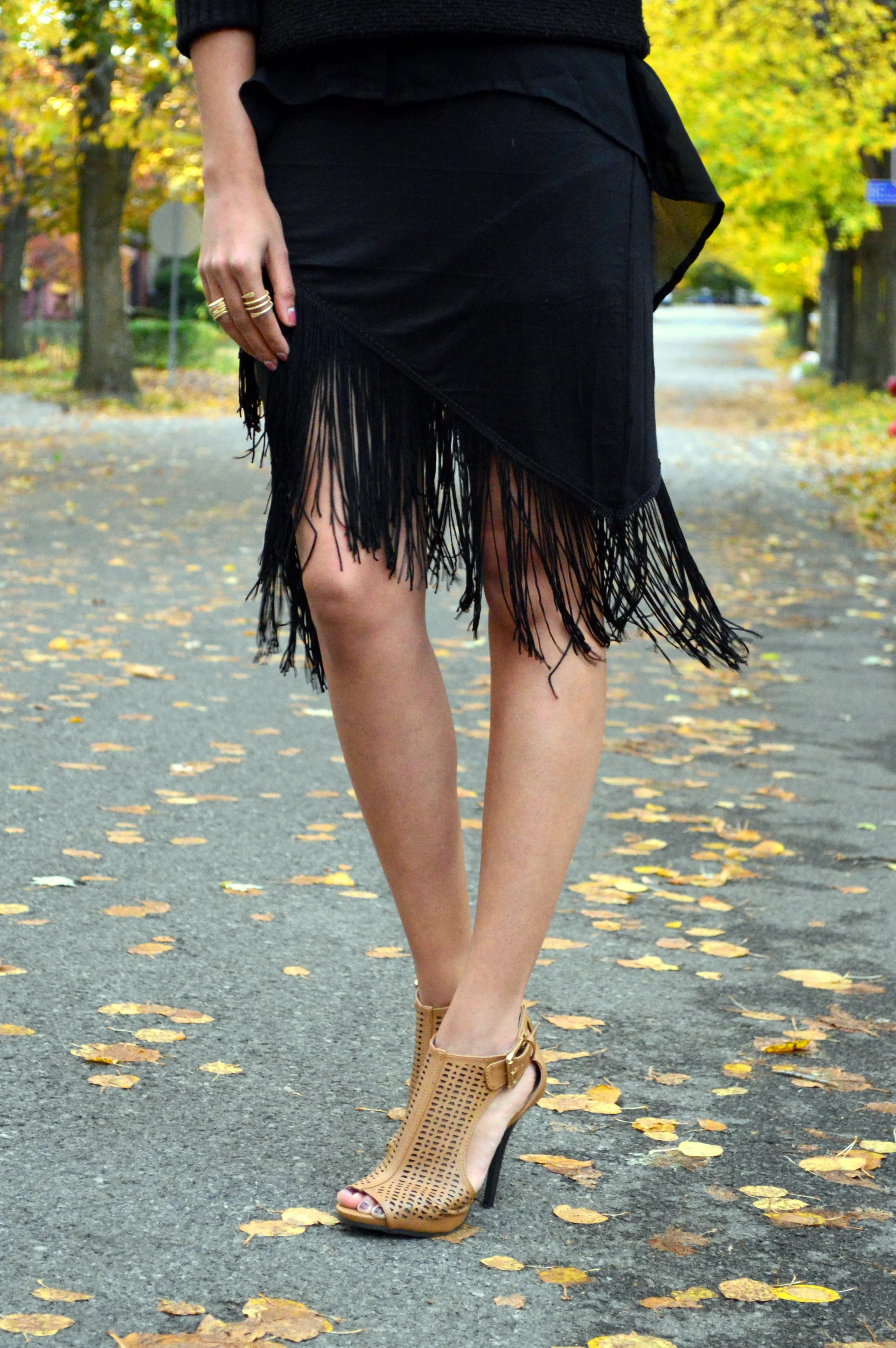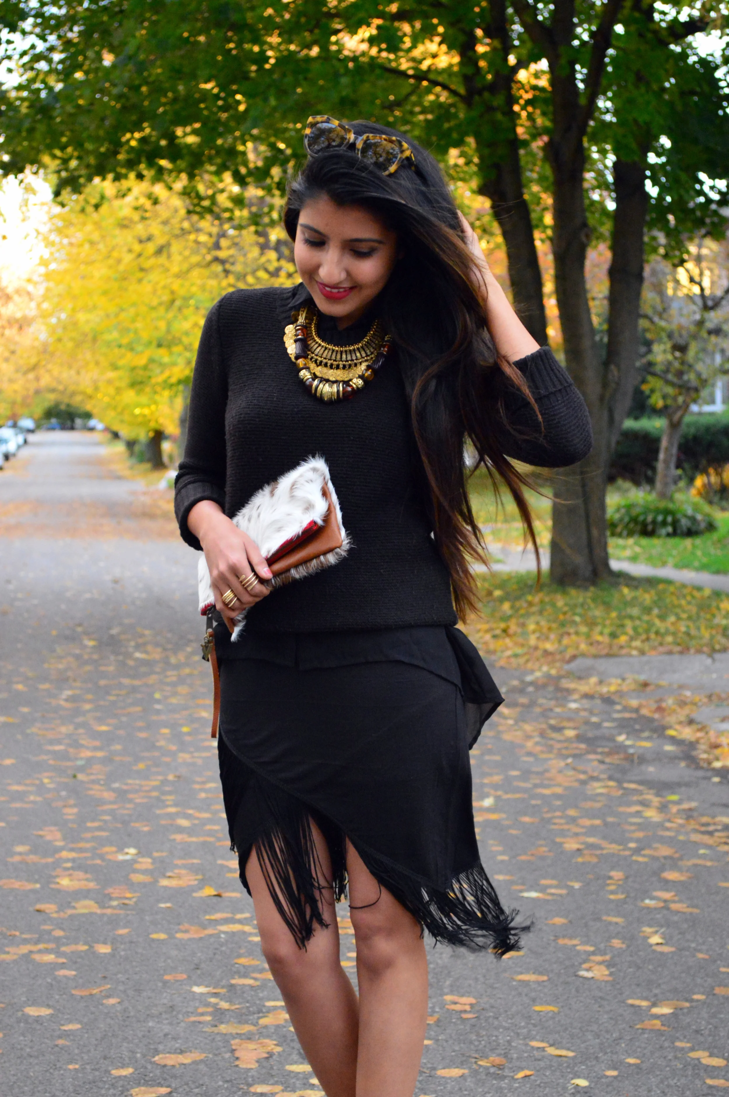 Fellow Disney fanatics may have shed a tear or two when hearing these words as the pivotal soundtrack to Beauty falling in love with the Beast, but what I'm stealing them away to subtly introduce to you is an age old color combination for the colder months that I've lately re-discovered my love for: Black and Camel. Tried and tested and true, it's a failproof recipe for any mood you may be in! It being Friday 'n all, I went the date night glam route and used an all black outfit made of a chunky sweater over a wispy shirt and a fringe trimmed wrap midi skirt as the template for statement camel + gold accessories, but the color scheme really is a gift that keeps on giving. Glam no bueno? No problemo! I've used the pairing as inspiration for several casual outfits already this season- A chic black sweater + camel suede skirt combo, a black on black sweater and jeans pairing with camel hat + booties for company, a black LBD with a camel blanket scarf. Seeing that they're two colors that we all own, it only takes a fresh pair of eyes to dream up so many more outfits. :)