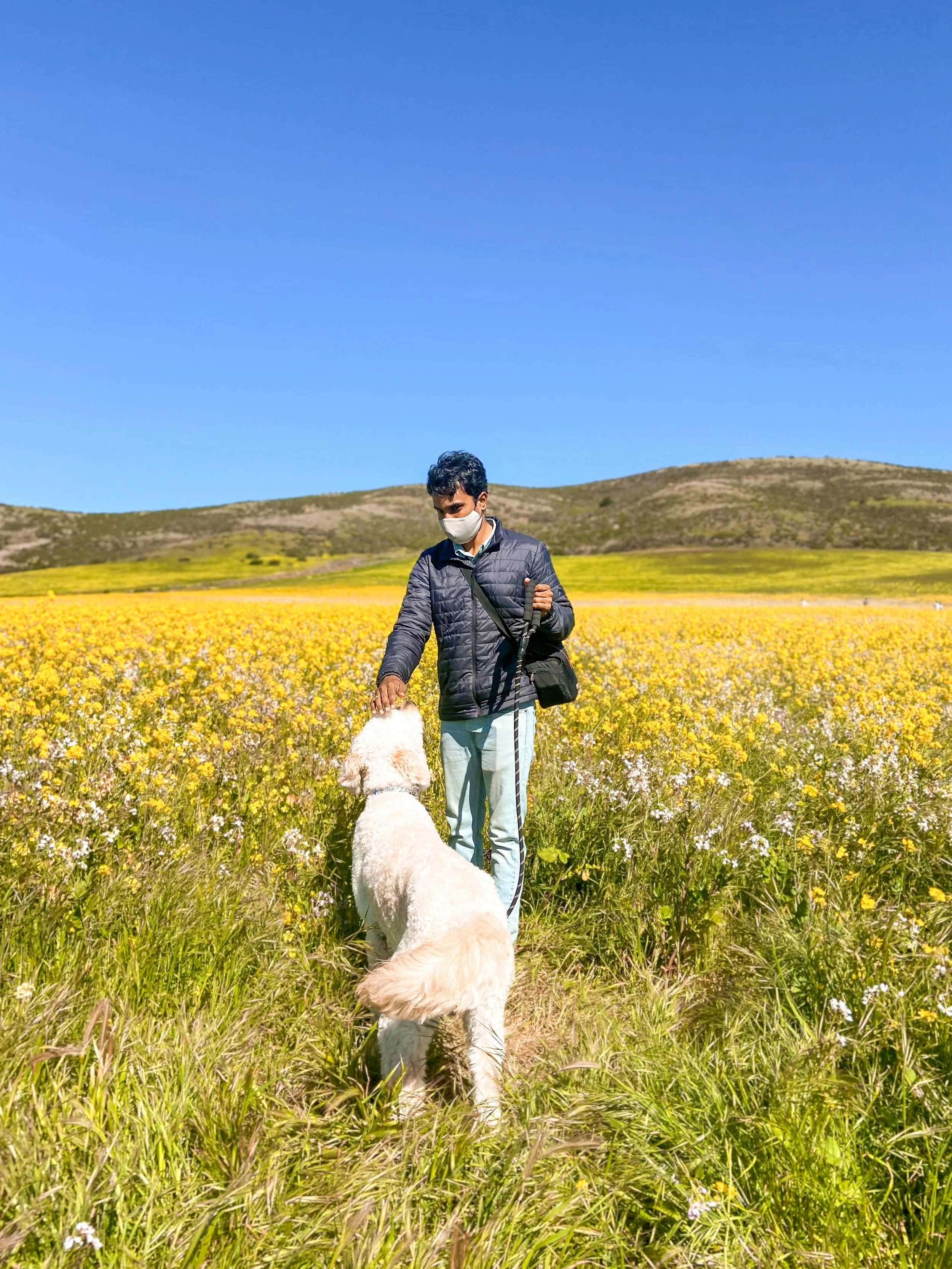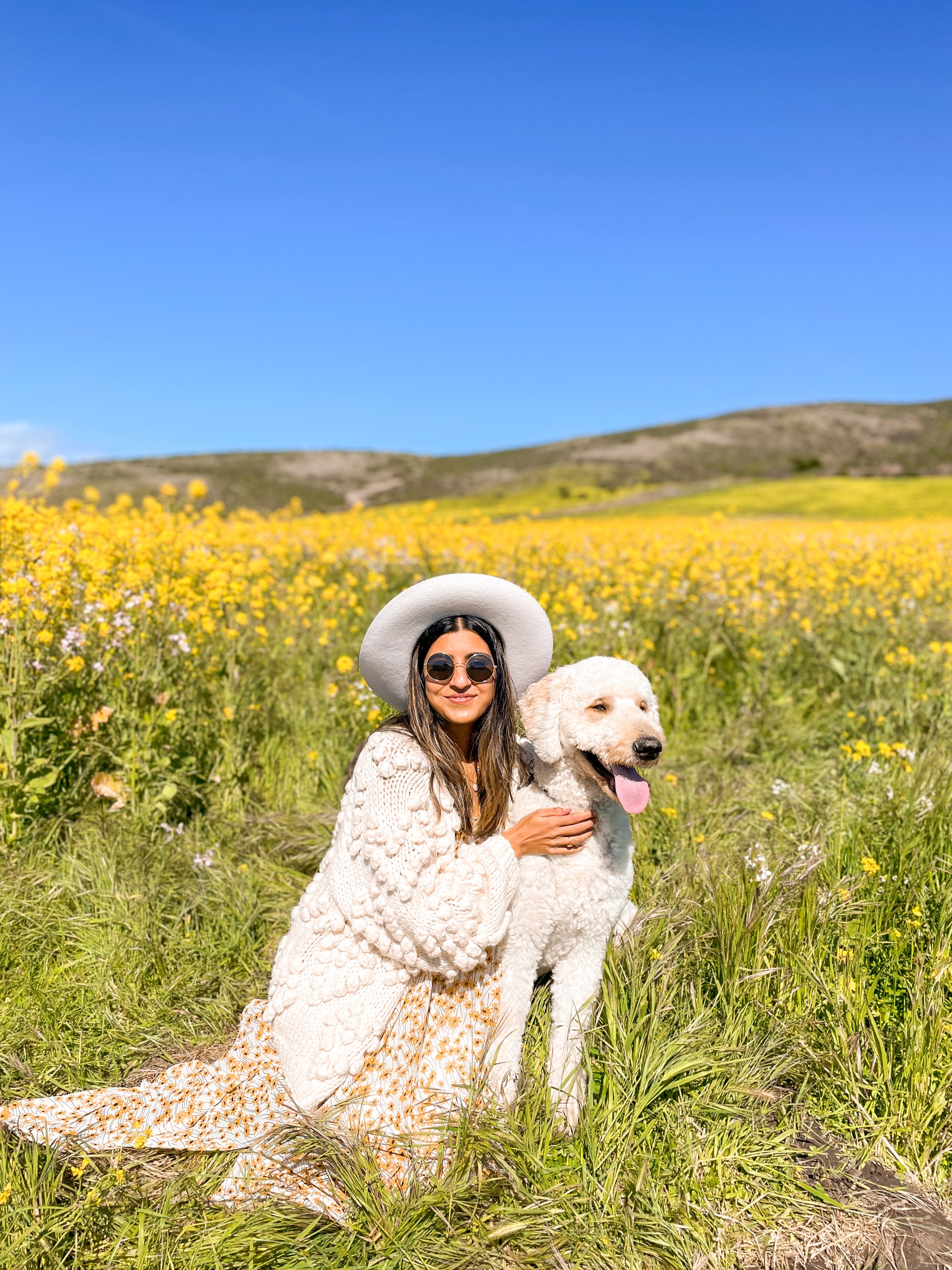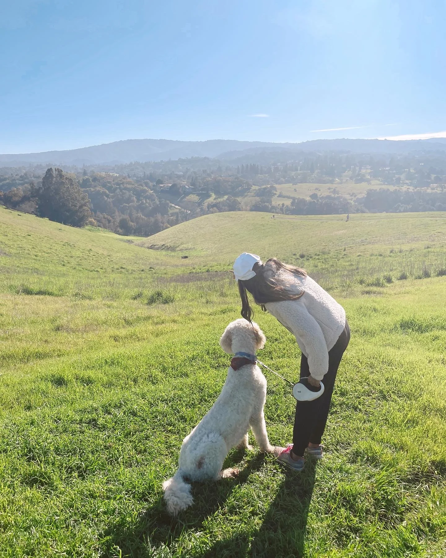 Winter weekends produce a real internal fight in me. Like, why does nature gotta be at its award-winning best right when the weather is award-winning unfriendliest, you feel me? This year though, I’ve decided that the temperature matters not, for the rewards of a good rainy season await at every corner in sight! And so we went with puppy in tow last weekend to a nearby dog-friendly gem- the Arastradero Preserve. The sun was shining, wildflowers were swaying, the rolling hills of grass were alive… I know I know, I think I’m John Steinbeck over here. In sum, just about everything felt right in the world for those fleeting hours we were hiking in the Preserve. Needless to say, Brio was in his element, his good mood going so far as to patiently sitting and listening to me extol the virtues of a good view on a sunny day. Paw-rents, save this one for your next family outing!