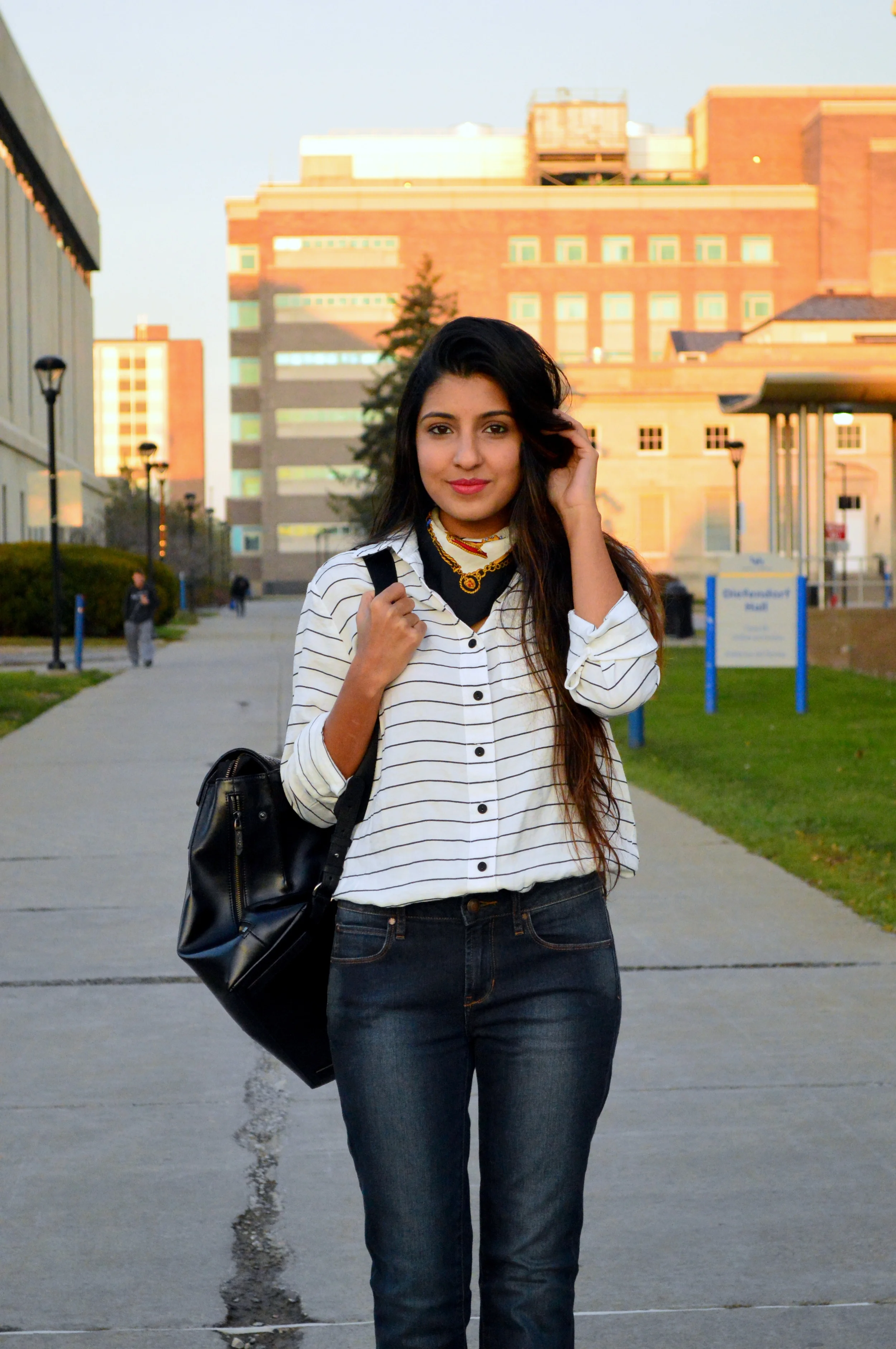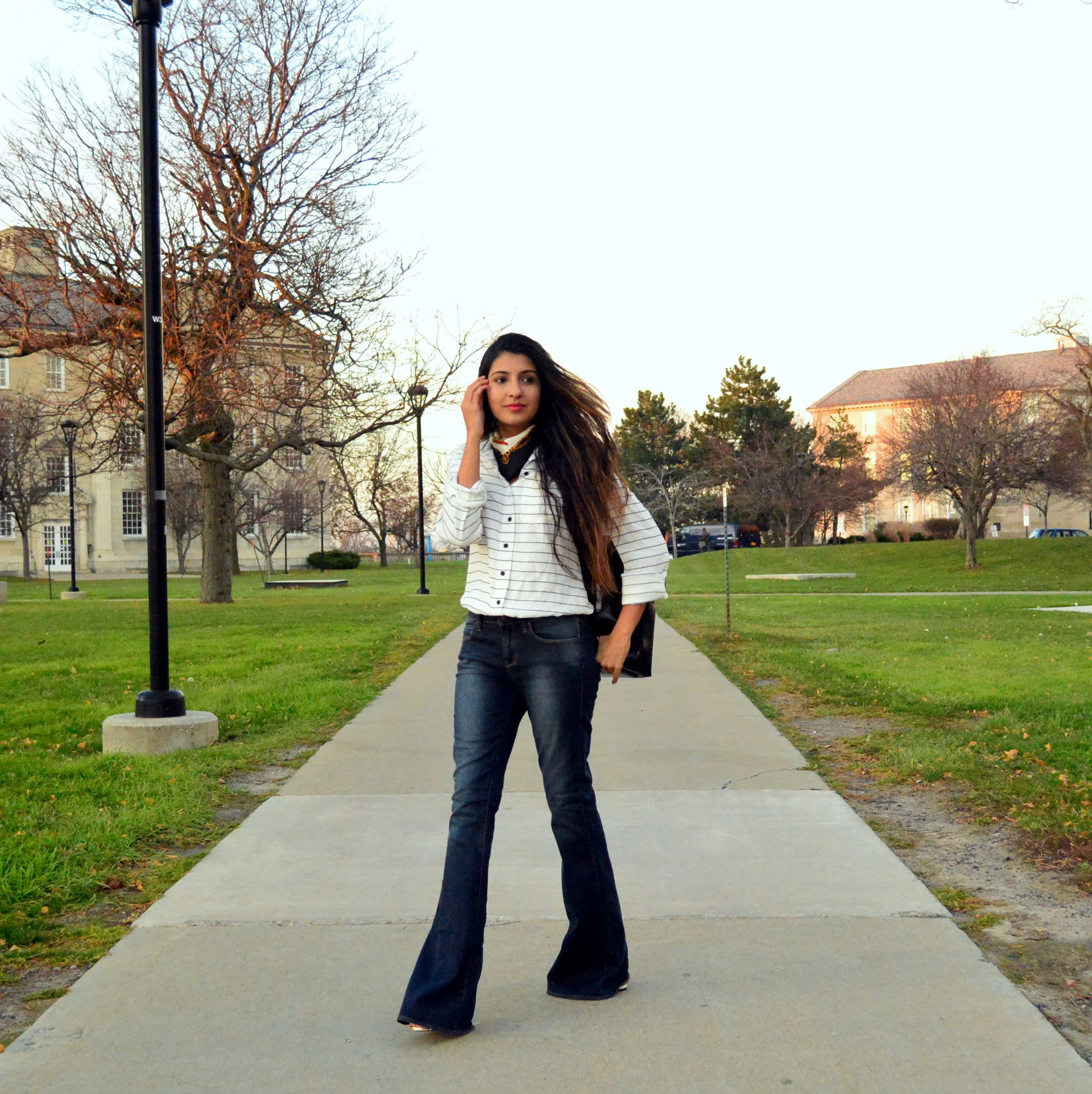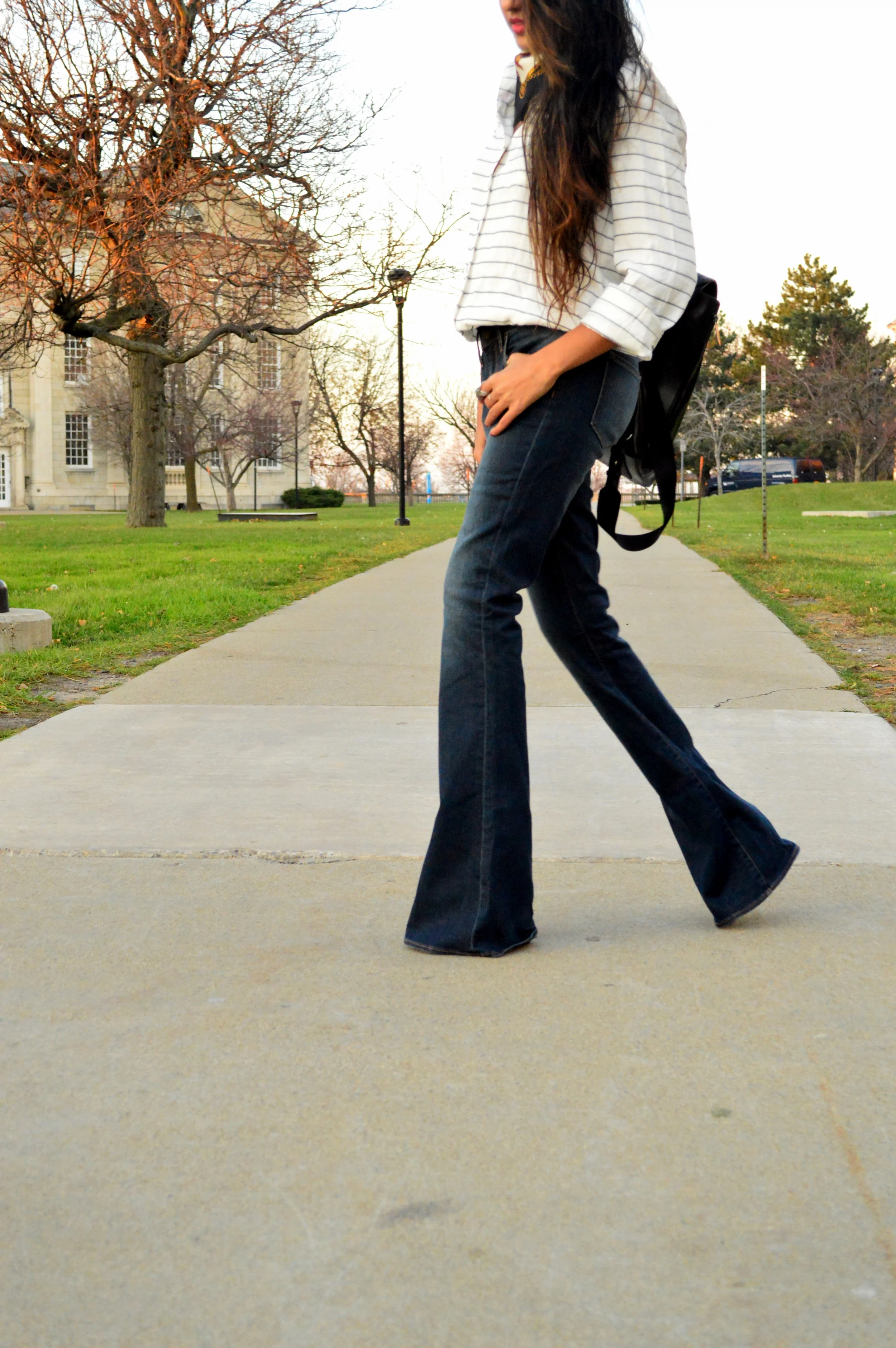 /Hello, hello from one busy bee to another! It's been one of those weeks with non-stop go time and few breathers in between, so it's fitting that I've been living in this casual uniform of a basic striped buttondown shirt and comfy flares- Two pieces that I'll always own and treasure for their timeless appeal. Old and new accessories update this simple look- a classic Adrienne Vittadinni silk scarf that was a lucky thrift score and a chic backpack by South Korean brand Flat Iron. As a graduate student, I'm always looking for chic bags that can be functional enough to carry my heavy school load, and this black leather option has been a perfect fit thus far. For those of you interested, Flat Iron is now available on Amazon. :)