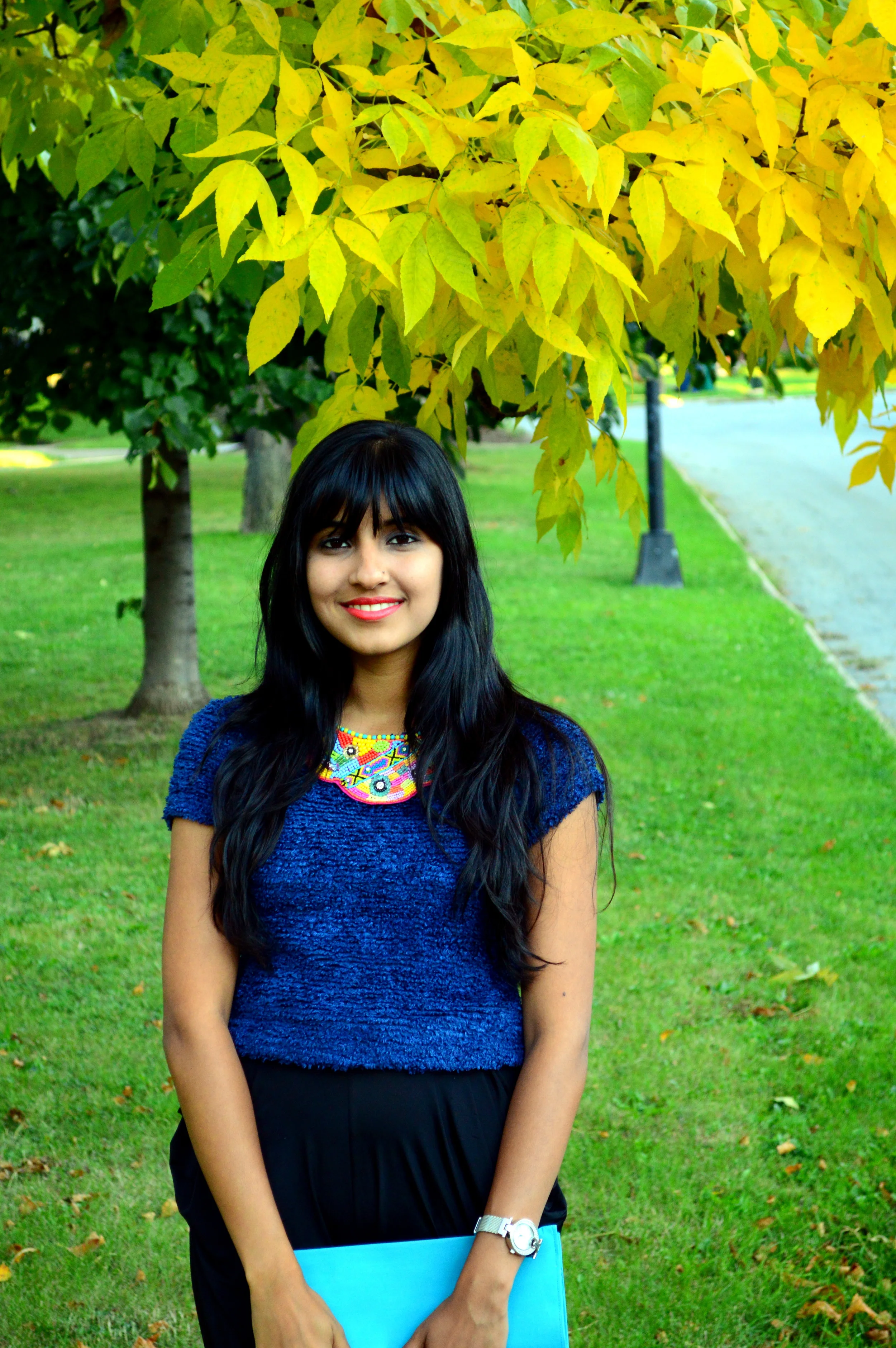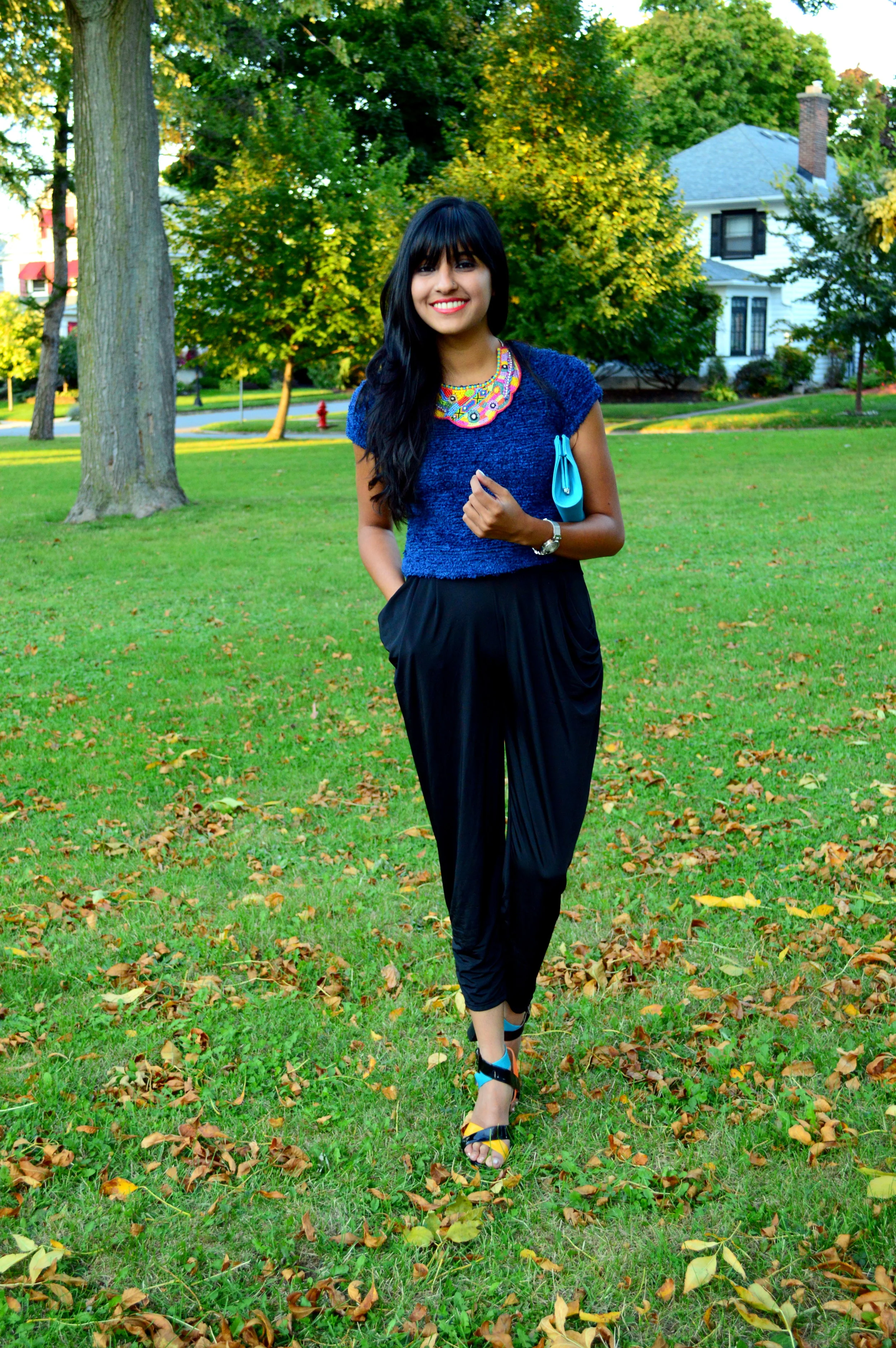 The general convention followed by many, including myself until recently, is not to pair dark colors together. I've come to find that this could not be further from the truth... In fact, black and navy is now one of my favorite color combinations! There's an understated sophistication to this combination of two individually strong, elegant colors that is hard not to love. On a recent warm, early Fall day, a fuzzy navy cropped sweater with black harem pants seemed appropriate for a viewing of the pretty Fall leaves in our neighborhood.