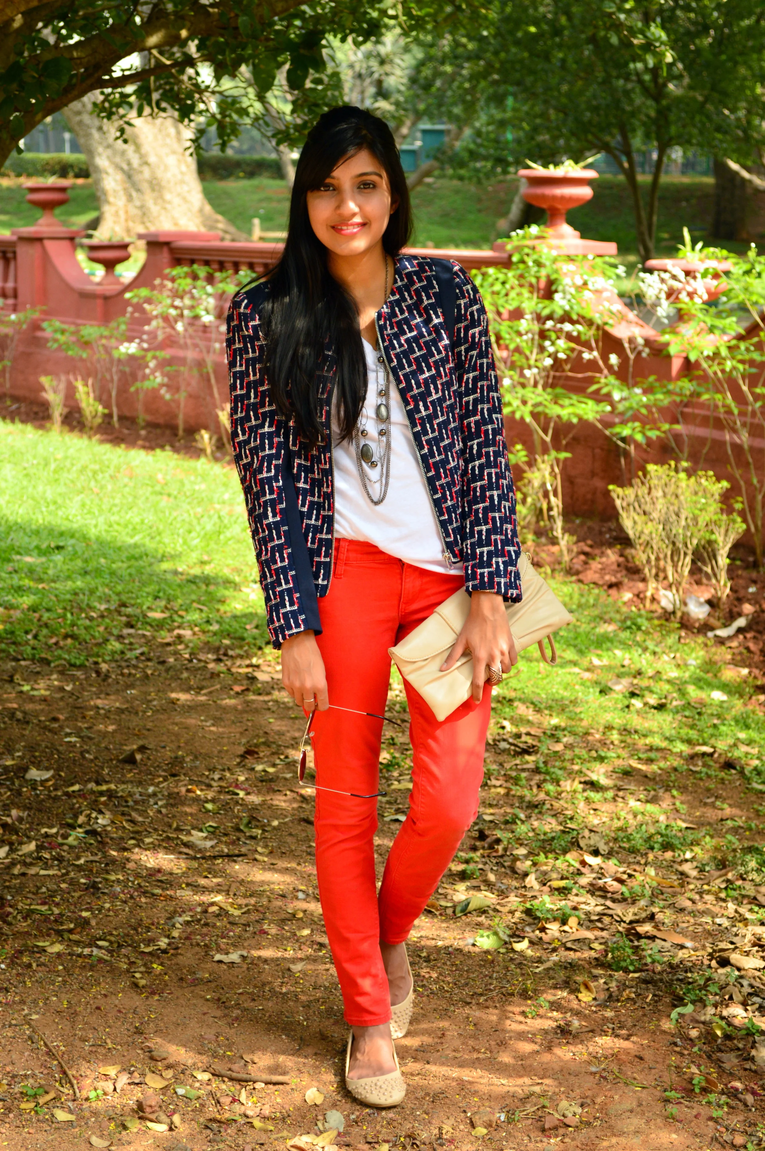 I couldn’t think of a better way to embrace the tropical climate here than to pick out the brightest color in my suitcase and style it as appropriately as I possibly could without melting into a puddle of sweat! For this casual outfit, pairing the bright red pants with a white tee was a no-brainer… Topping it off with a statement jacket with interwoven threads in navy, red and white that gives it a tweed-like finish took me from daytime exploration of the local gardens to drinks with friends in the evening.