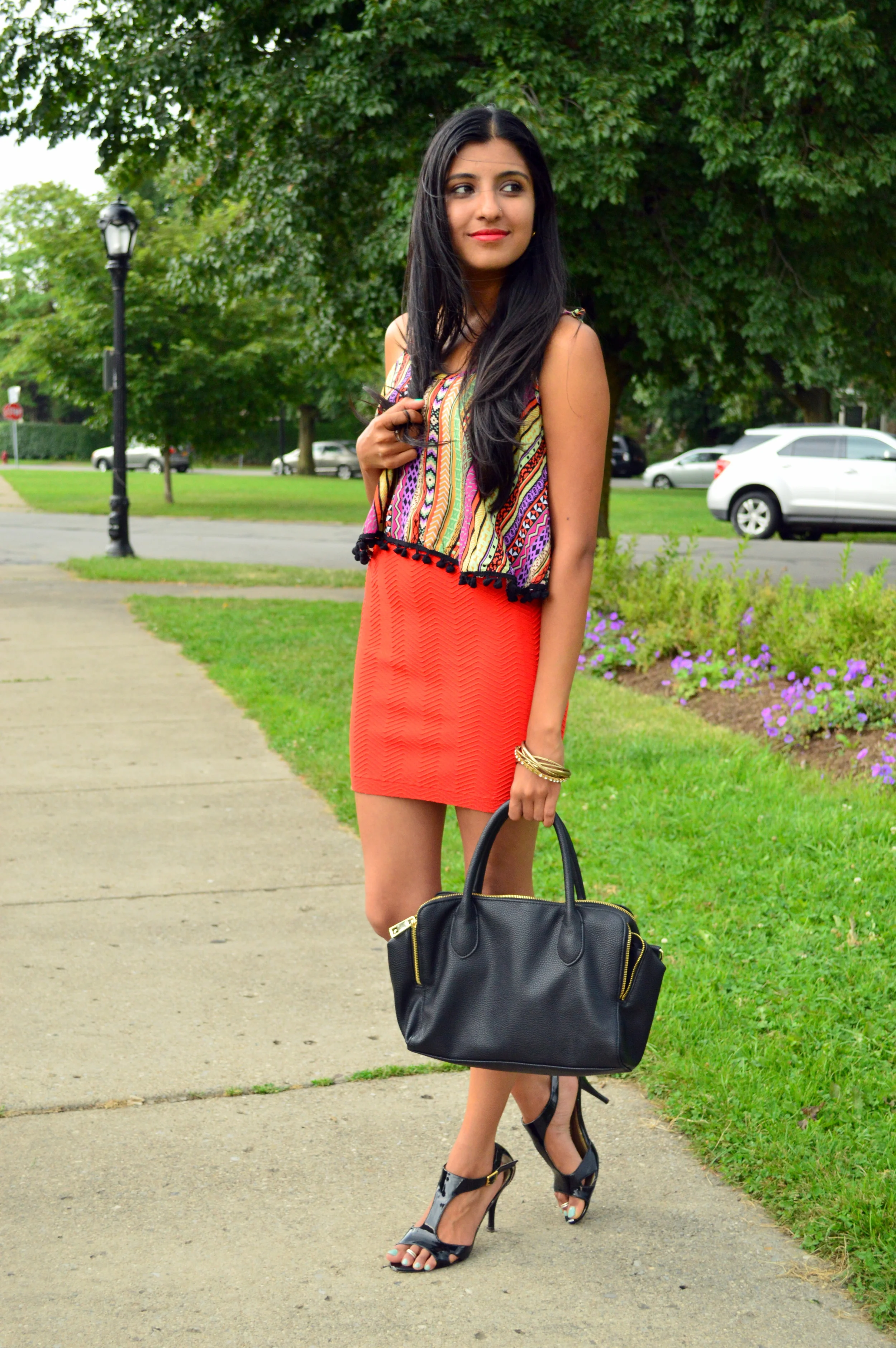 I call this the perfect summer outfit because it combines so many trends of the season so seamlessly. There's my most beloved pom-pom trim on the swing tank (as evidenced first in this post).. the stripes have a mix of aztec and tribal prints.. the skirt is a fun neon orange, which along with all the colors in the tank, makes for a big happy basket of summer brights. Enough reasons to un-furrow the eyebrows and look happy for the camera, I would say.