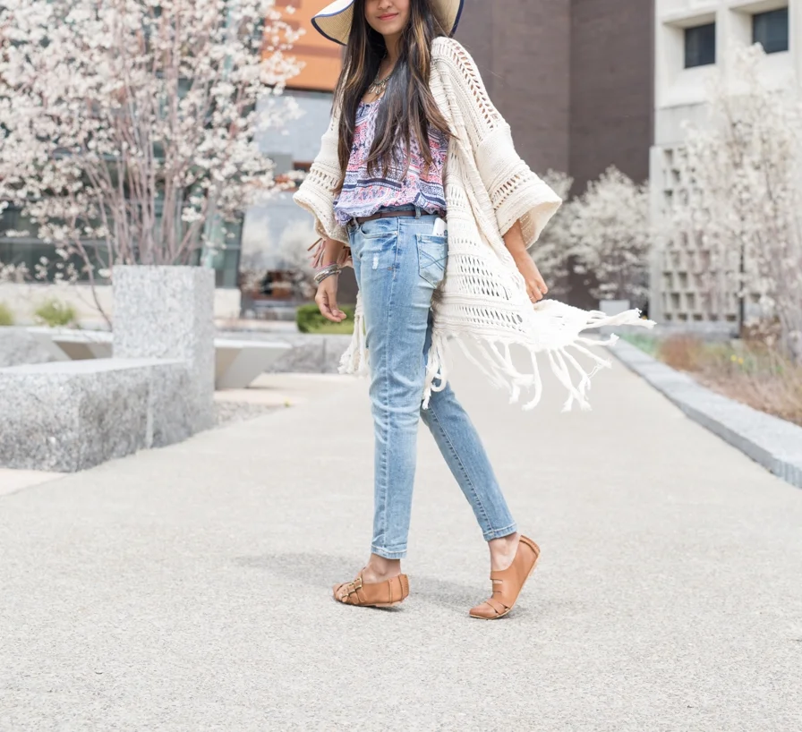 While you take a second to pat me on the back for my dedication to blogging during such a time of crisis ;), also take a second (or 60!) to appreciate my newest favorite piece of outerwear- this perfect boho chic crochet duster cardigan, which had me at hello with its bell sleeves and tassel trim. Being confined to the city most of the time, I threw it on over a casual printed tank + distressed denim combo, but I can't wait for a beach day when it'll also make the perfect coverup! Also on my current crush list- these strappy super comfy flats made of the softest leather that I've been wearing to work and play for several weeks now. #shoegamestrong