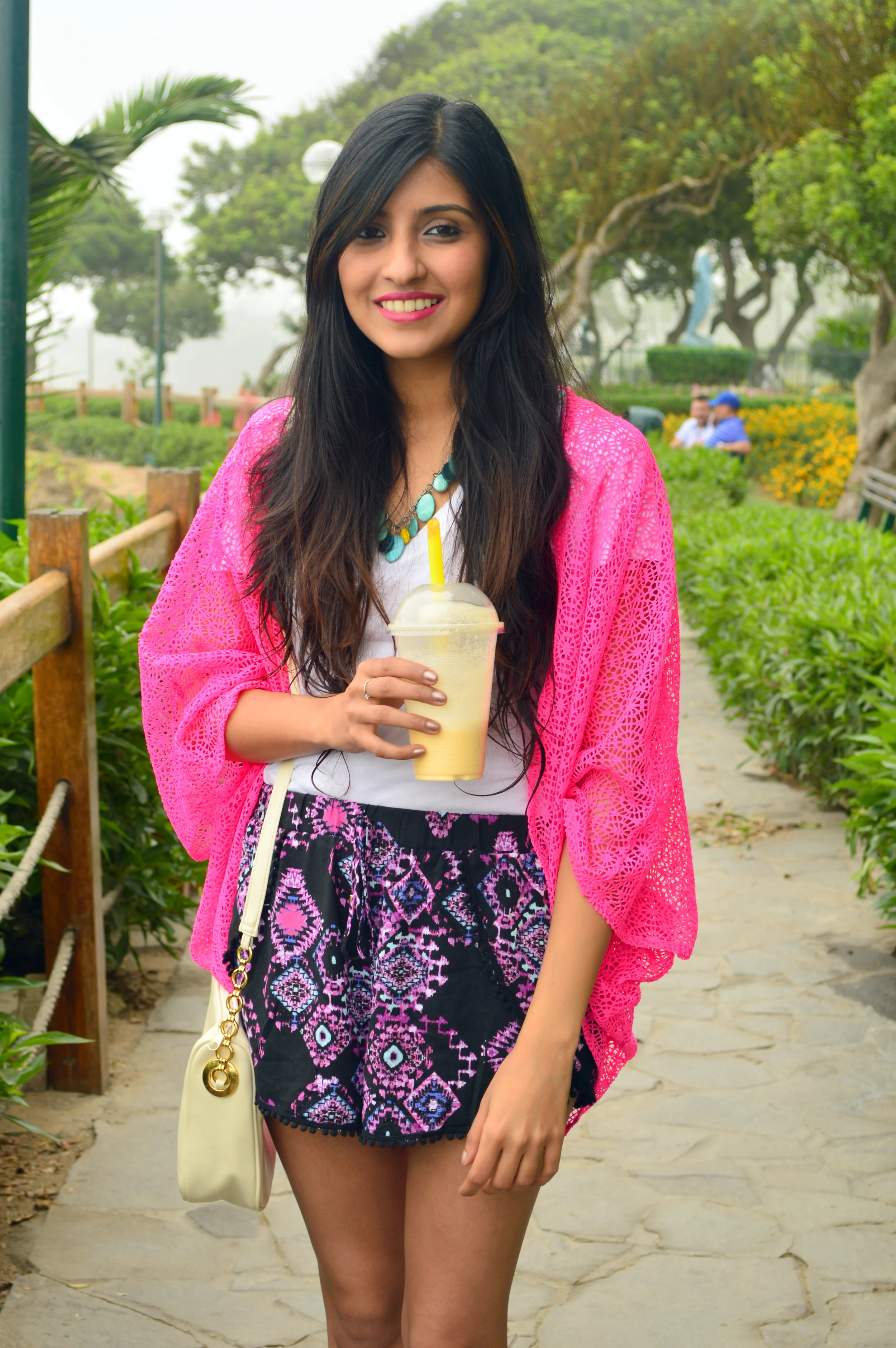 This is the second look that I wore while vacationing in Peru on our second day in the capital city of Lima, with a relaxing morning in our Miraflores neighborhood on our agenda before flying out to Cusco later in the afternoon (when I switched out my shorts for a comfy pair of jeans). Our Air bnb apartment in Lima was in the popular, upscale coastal Miraflores district, and we had everything we needed to see at walking distance.. Some of the best food and views of the South Pacific in the Larcomar outdoor mall and the iconic Parque Del Amour (Park of Love), where we shot these photos. We set out relatively early to escape the crowds that throng the park as the day goes on, but unfortunately ran into heavy fog that hid the beautiful ocean views we got later on. If the sky and the sea seem to blend together in the pictures to create a white canvas, you know what was up. :) I absolutely adore this neon pink crochet kimono from Thera Clothing! I'm very partial to crochet in hot and humid weather, and this one's going to be the perfect layering piece over casual outfits or even as a coverup on the beach.
