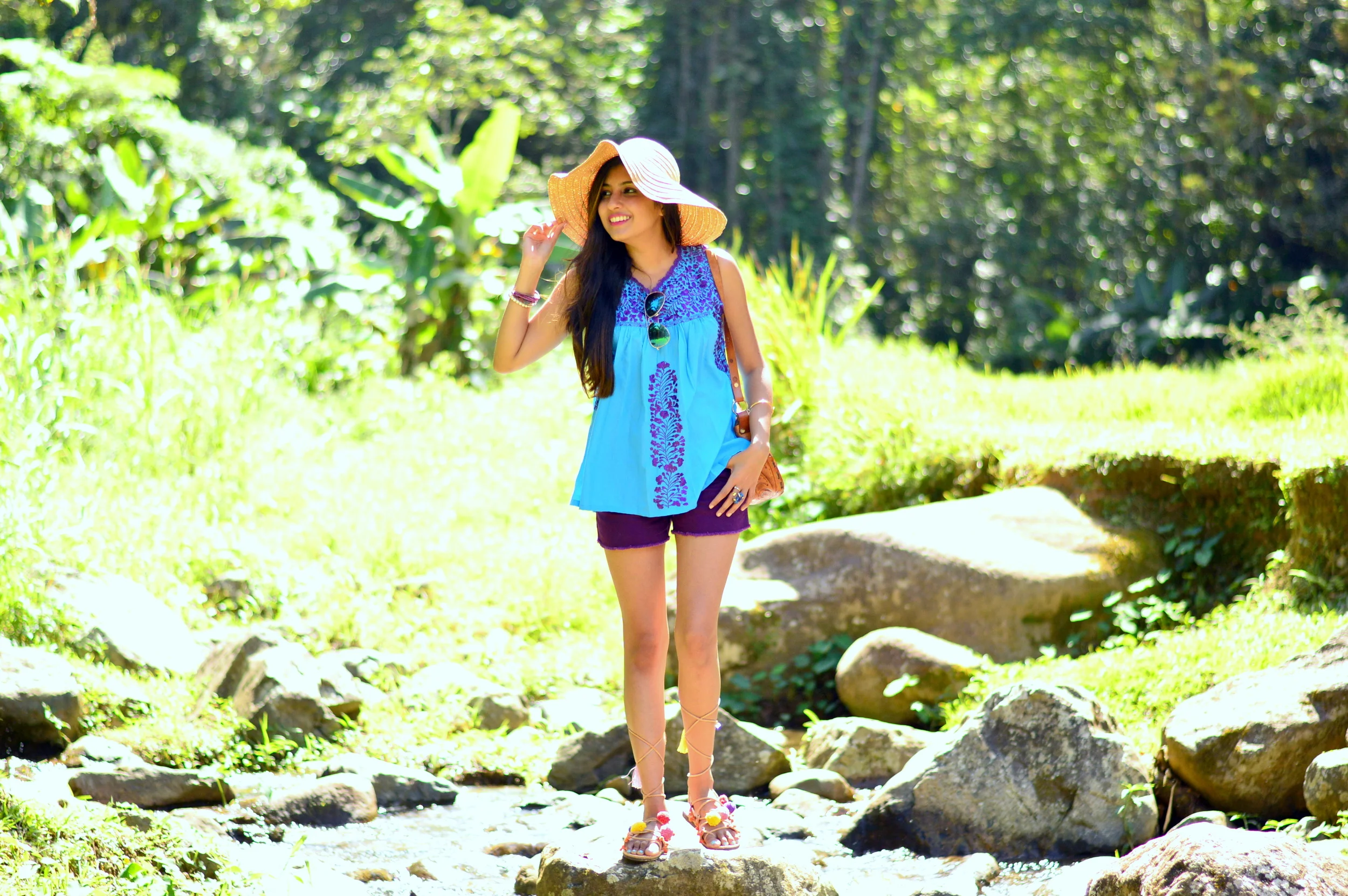 It was a hot, hot day, so I dressed casually, but in bright colors and fun accessories. The mexican embroidery on this light and roomy Santa Marguerite top is to be seen to be truly appreciated.. it's just so pretty! Several other tropical vacation essentials in the mix- a nice and wide floppy hat, druzy blues for the hands and statement pom-pom sandals that I may just be wearing all summer long, whether on vacay or not! :)