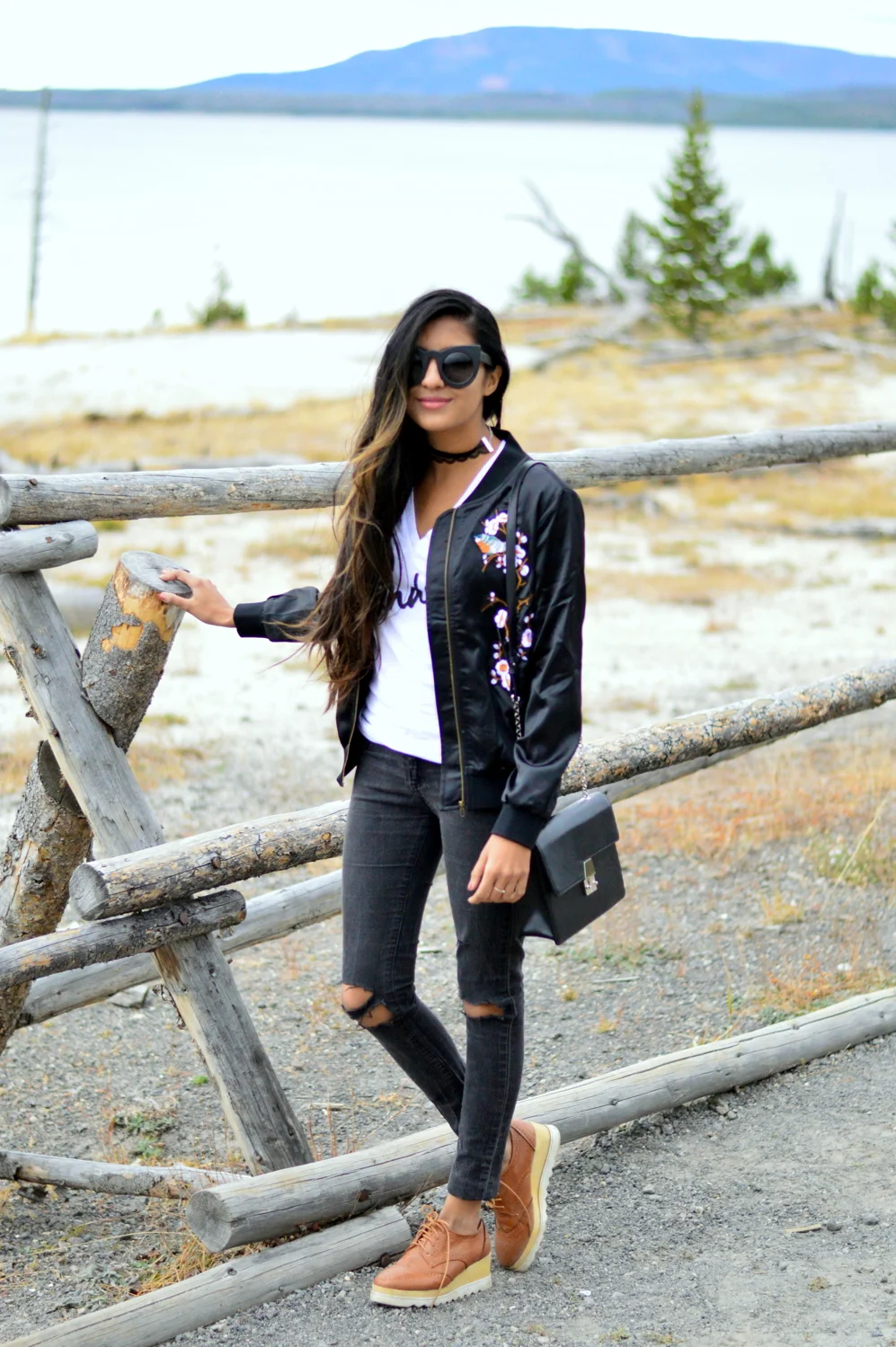 This first day was relatively the warmest of the weekend, so I wore some light and comfy layers for exploring. I fully credit our bison spottings to my 'wanderer' tee and I may have taken my intention to be one with nature a little too literally with my embroidered bomber jacket, complete with ombré petaled flowers! ;) Its a tricky thing to keep both form and function in outfits when traveling, but accessories like these platform oxfords and the chic-est velvet + lace choker take away all the effort from it. I have a sneaky feeling they're going to be on repeat all through fall and winter!