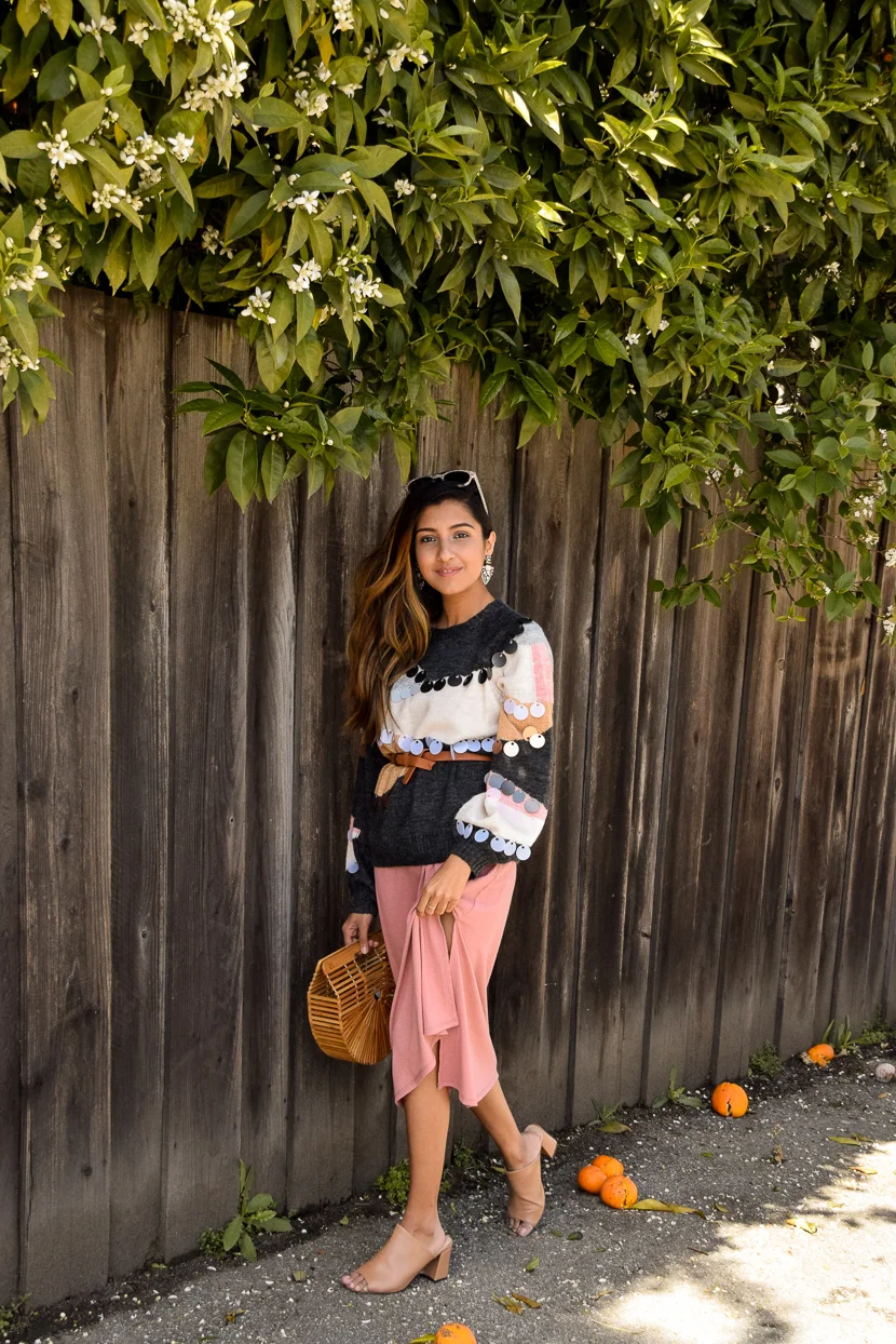 The reasons to love a slip dress are many, and my favorite reason of them all may be their versatility. I own exactly three slip dresses- one jewel-toned mini that I styled as a top in this post, a vibrant floral one styled in this post and this pink midi version that I recently wore in Sonoma and shared a quick look of in this post. You can bet that I’ll be re-styling this slinky pink number with any number of jackets, blazers and such in the upcoming months, but since temperatures in NorCal have been playing catch-up at snail pace this year**, I’ll not be skimping on the cozy yet, please and thank you.