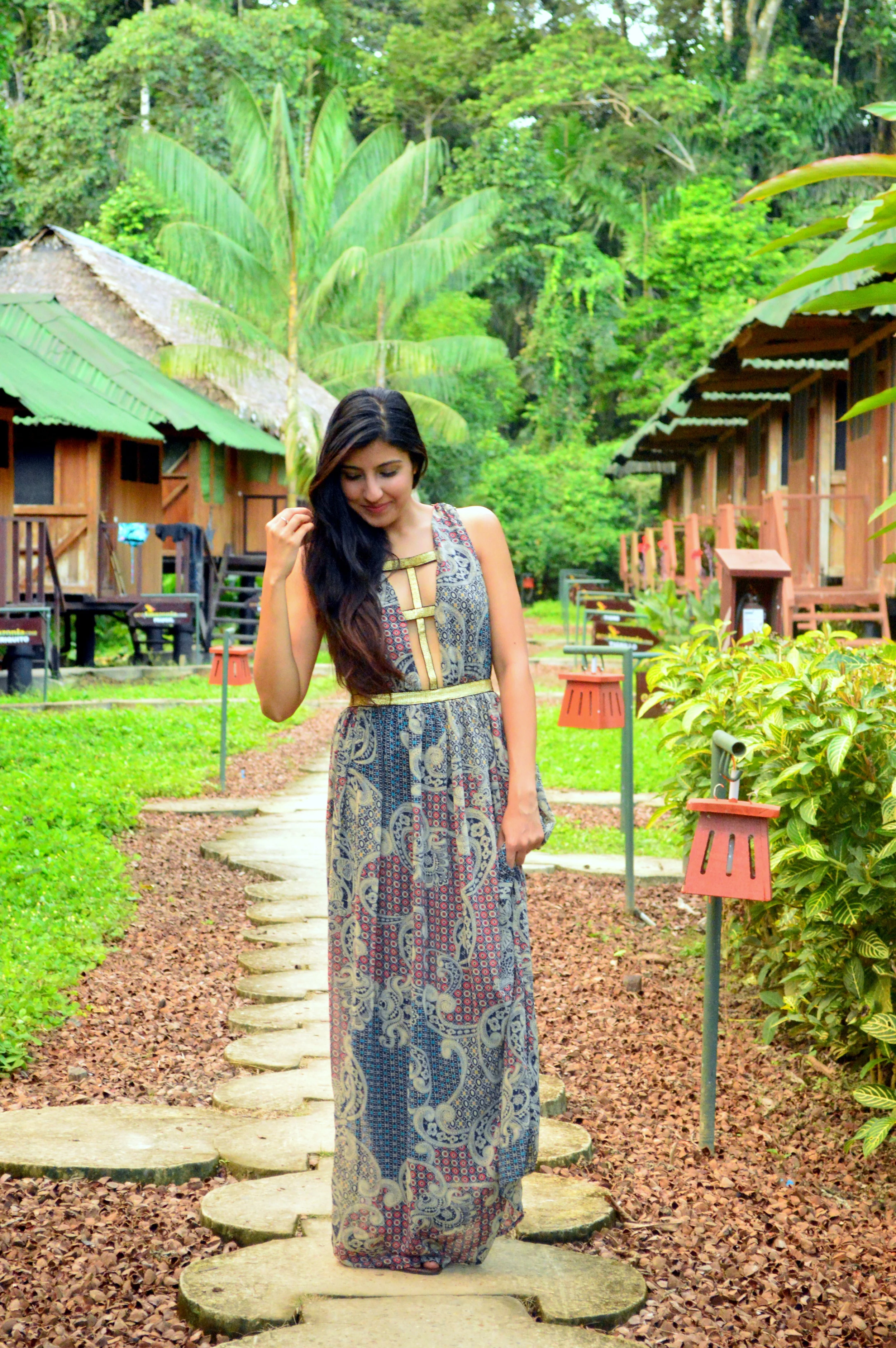 /Happy Monday, folks! Wasting no time in taking you guys back in time with me to the Amazonian rainforest in today's post! This is the last and final look from our vacation in Peru, and we shot it on our last leg of the trip on the beautiful property of the EcoAmazonia Jungle Lodge in the heart of the Peruvian Amazon jungle. After having spent a relatively intense week in Cusco and Machu Pichhu, our bodies were begging for some respite and R&R time when we got here! Despite the upward swings in our blood pressure upon the sightings of a large family of Caymans' feeding frenzy, a menacing river otter chase, tarantulas and the footprints of a tapir (if only this childhood dream had been realized by the appearance of the actual animal itself! Sigh.), R&R was what we got, mostly in the form of a continuous supply of fresh fruit daiquiries and endless hours of laughter with friends over memories old and new. Of course, much of that laughter was aimed at my panicked alarm upon finding out that an 'ecolodge' meant no electricity or internet (Read as: Instagram. :|), but that wasn't anything a little time on the hammock with a nice little novel couldn't fix! It was actually quite liberating to be completely disconnected like that, but I can't say I wasn't some what glad when I switched my phone on back in the city. ;)