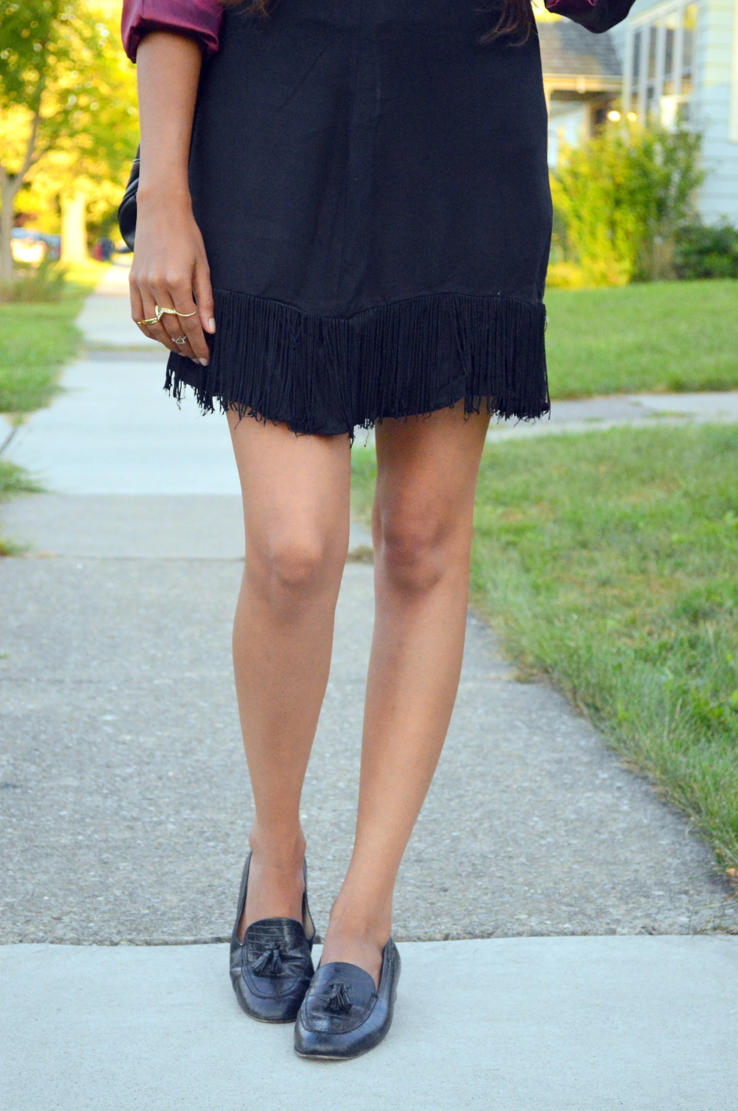 /If you've been reading this candid corner for a bit, you're probably familiar with the recent promise I made (in this post) to give more wear to my older, recently ignored clothes in an attempt to milk the most out of a well curated closet. True to my word, I'm doing just that in today's post and wearing all oldies-but-goodies, but first, there's a little story that begs to be told: Prior to and well after my claim to pocket money and allowances as an adolescent, the sole 'curator' of my closet was my Dad! He'd thoughtfully and painstakingly bring back the most wonderful assortment of gifts for my mom, sister and I - clothes, shoes, bags, jewelry, you name it- from work trips abroad, making us the proud owners of an eclectic and almost fashion forward wardrobe long before we became aware of it. :) It's a good thing he has always had uncanny good taste, I guess, because a whole decade or more later, I'm still wearing pieces bought by him! Case in point- This burgundy lace up top in luxe satin. I'm always on the fence when it comes to shiny fabrics such as satin and silk, but something about the vintage feel of this decadent blouse made me hold on to it over the years and I'm so glad I did! The lace up trend has been all the rage this season, be it as a neck detail in a top or dress or as a shoe design, and I personally love the subtle glam it can bring to an otherwise modest outfit. With a little fringe, classic black accessories, and the season's first dark lip, this look's part boho and part retro.. what do you think? :)