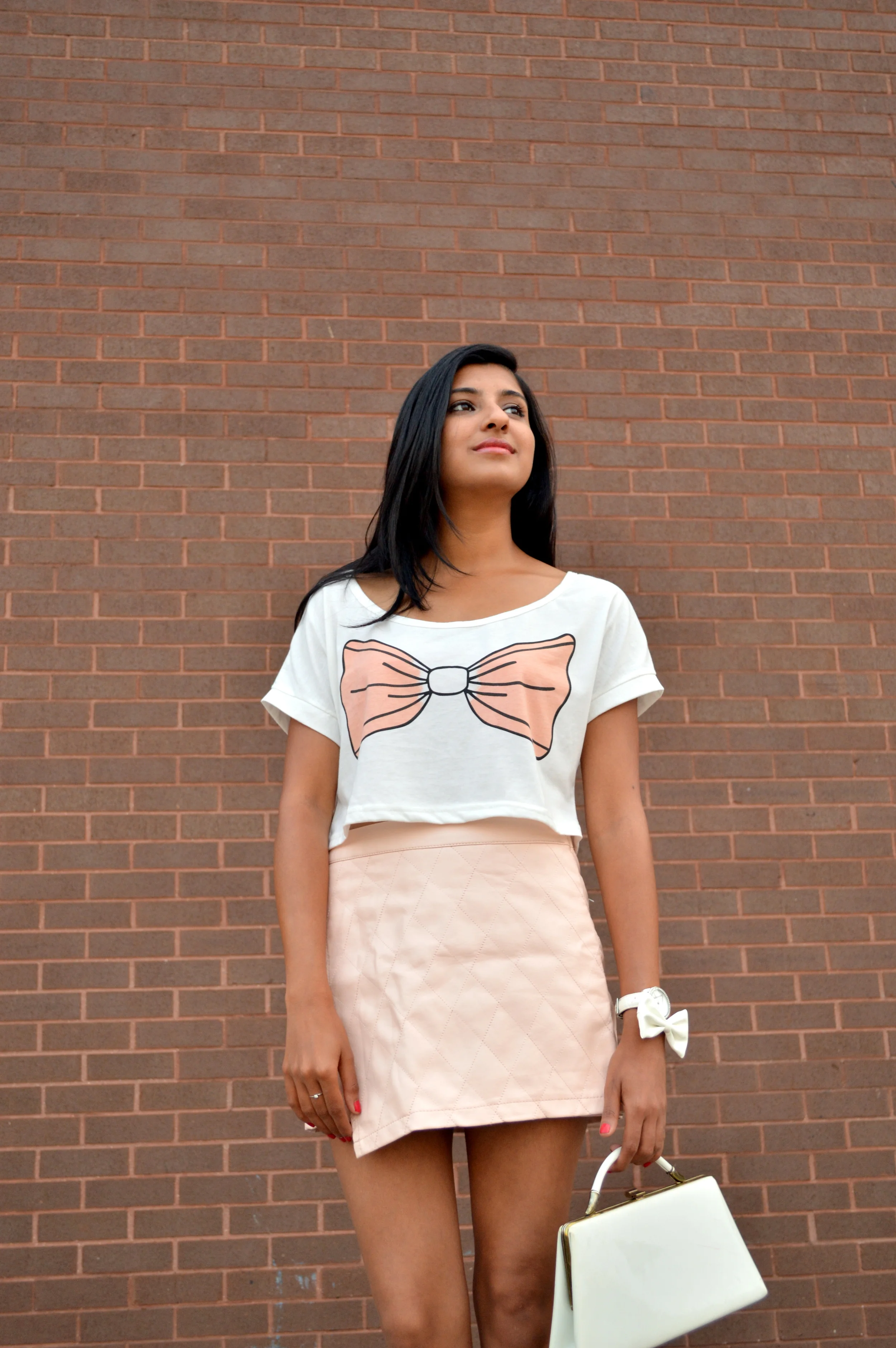 While my initial thoughts were to style the skirt in an edgy look that's typical to leather, I love the unexpected pairing of something edgy with more playful, feminine pieces. And what's more feminine than the biggest bow there ever was, right? :D Plus, I couldn't pass up on the chance to wear white the day after Labor Day, so. . .