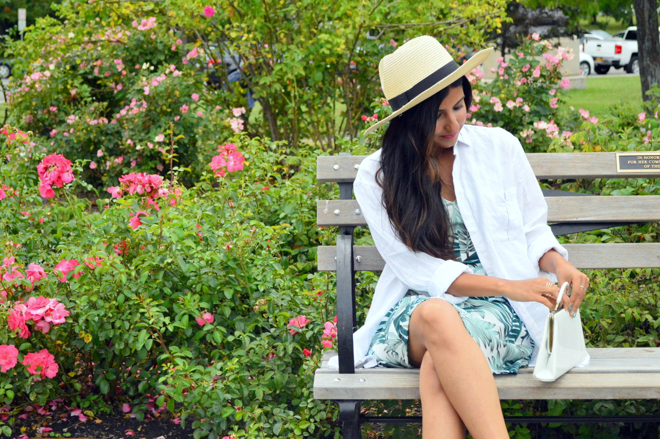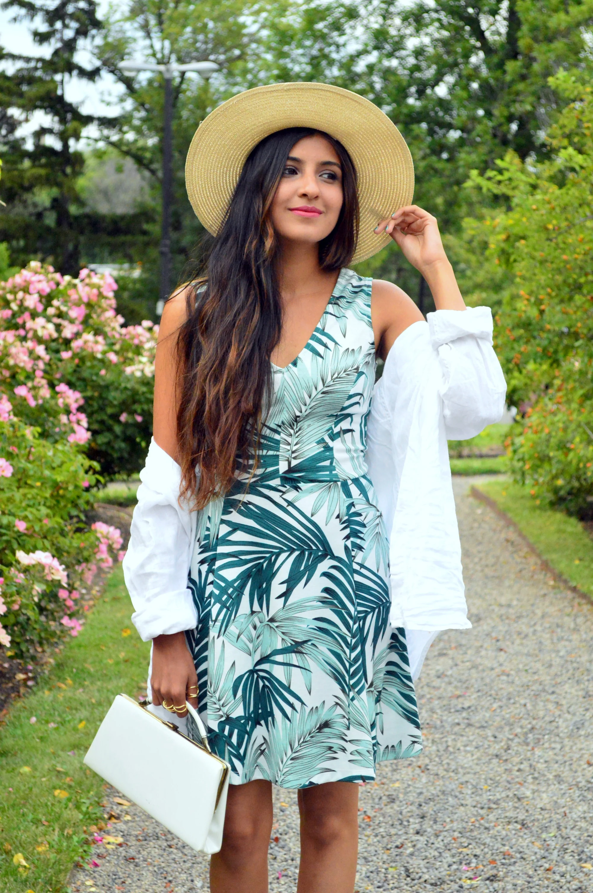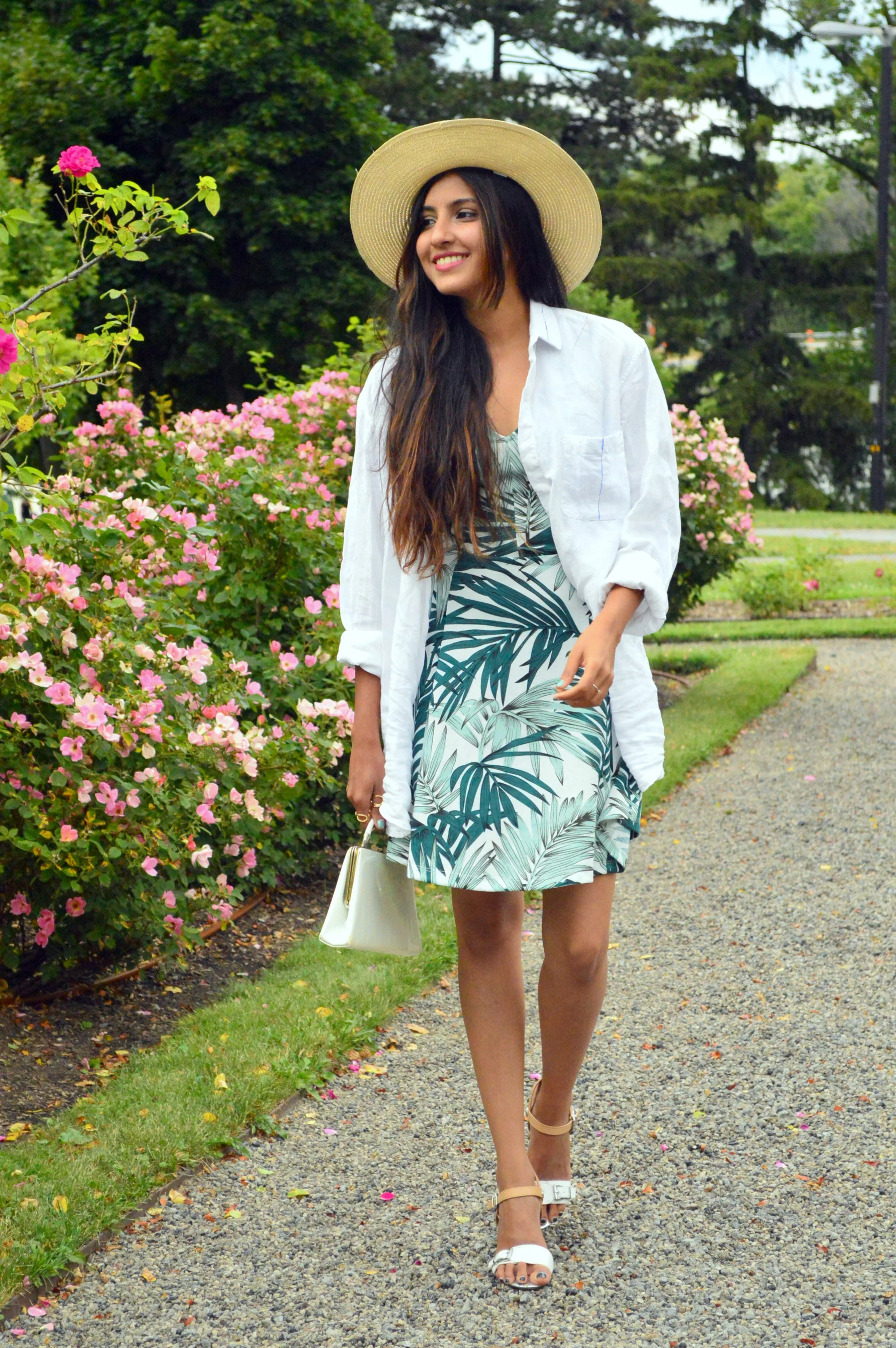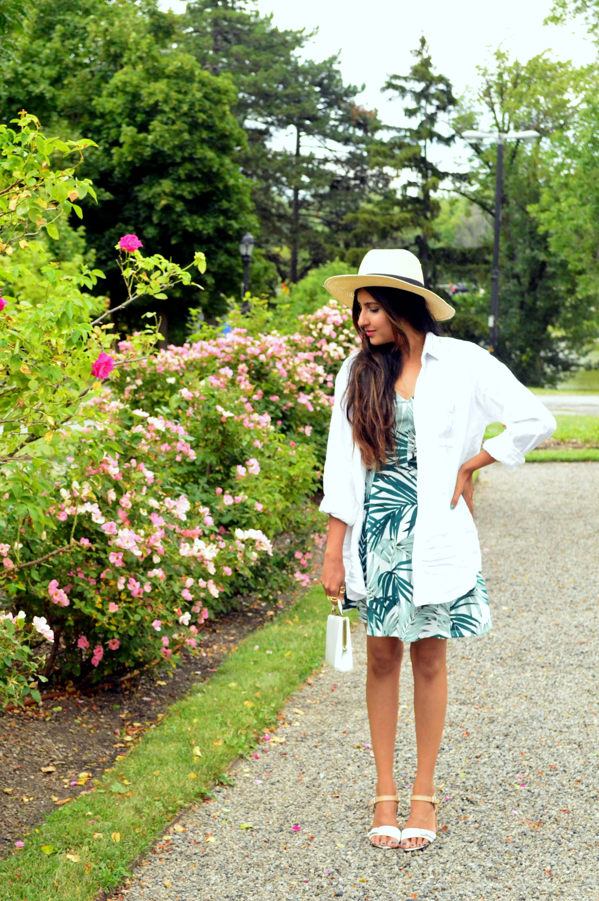 One of my favorite things about this time of year is the sight of roses in full bloom, and I'm guilty of running amok on the streets on more than one occasion just to smell their sweet fragrance. Imagine my delight, then, upon going to the rose garden in Delaware Park to find rows and rows of pink rose shrubs beautiful and blooming! I wore this fit and flare palm print H&M dress that I simply adore.. the fit is so flattering, the print is on point and the fact that I snagged it for $4 (!) during their July 4th sale makes it one of my best buys lately. Since the garden's located by the lake where it's generally windy, I threw on K's white button-down over the dress. I think it lends a cool resort-wear vibe to the whole outfit.. what do you think? :) While this look is casual, laid back and perfect for an afternoon stroll, I would switch out these accessories for a red lip, a nice updo and nude heels if I were heading to dinner after.