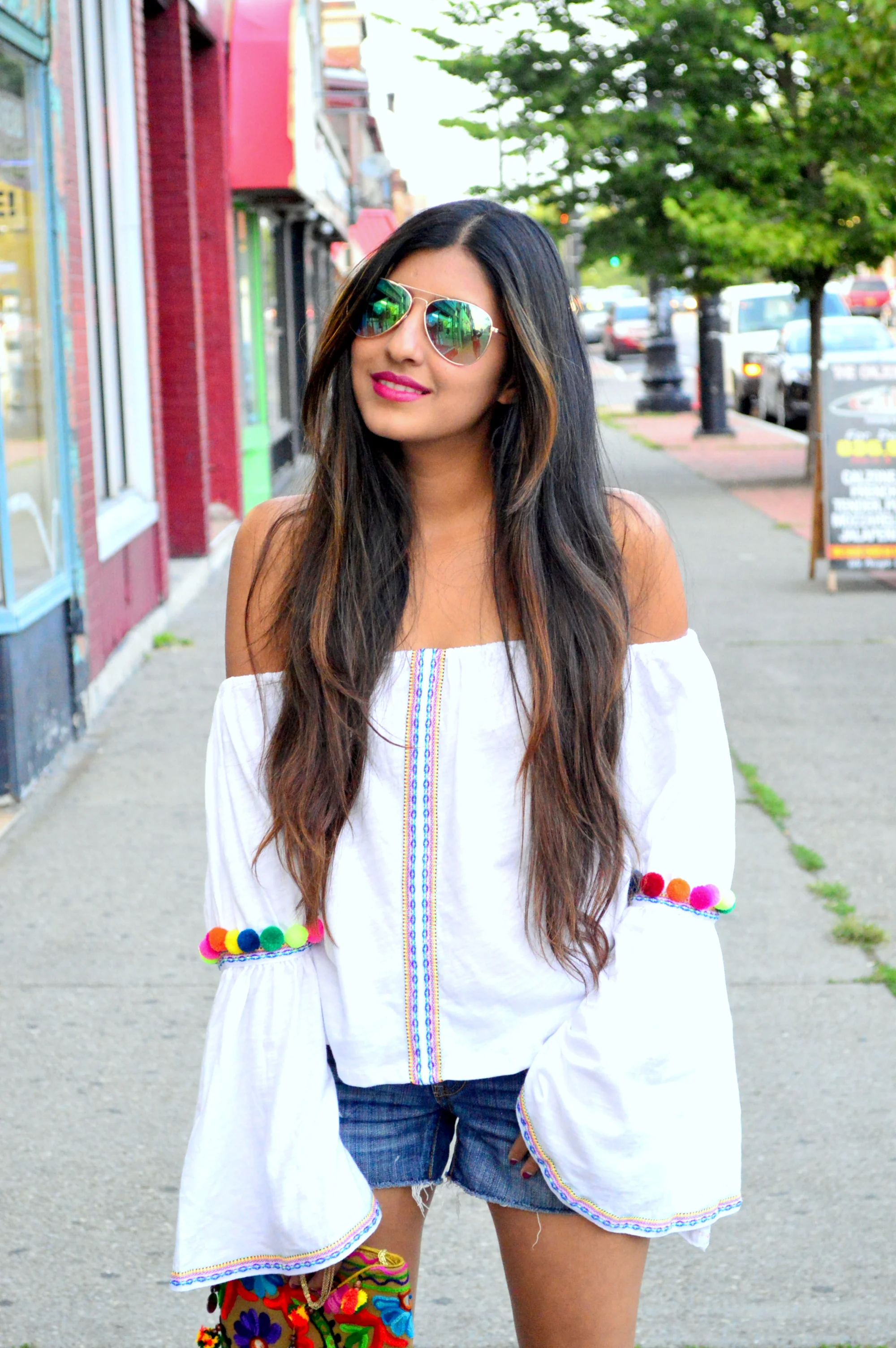 Pitusa houses a collection of the most fun, light and comfortable garments that are made in Peru. Having visited the beautiful country recently myself, I can truly appreciate how the pieces have captured the bright Peruvian colors and details in universally appealing cuts and silhouettes. One of my first picks from the collection was this bohemian-meets-the-70s off-shouldered top with bell sleeves, pom pom trims and embroidered details. We snapped these photos just before it turned dark on our way to a casual dinner on a crazy hot day, hence the distressed cut offs and reflective aviators. Boho continues to be all the rage going into Fall, so I brought out my treasured embroidered clutch to play, not realizing that the pom pom details on it happens to match my top perfectly! #winwin
