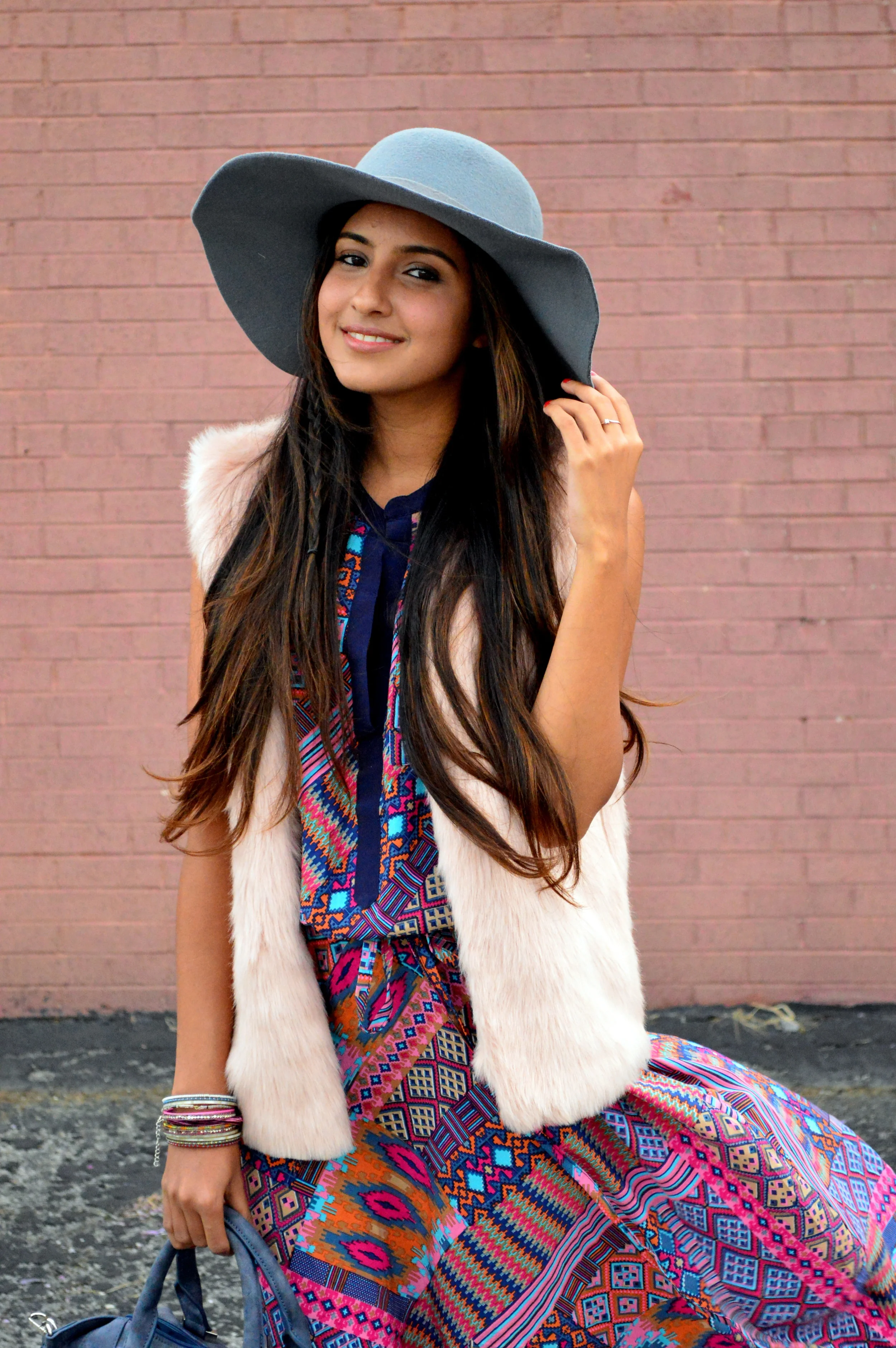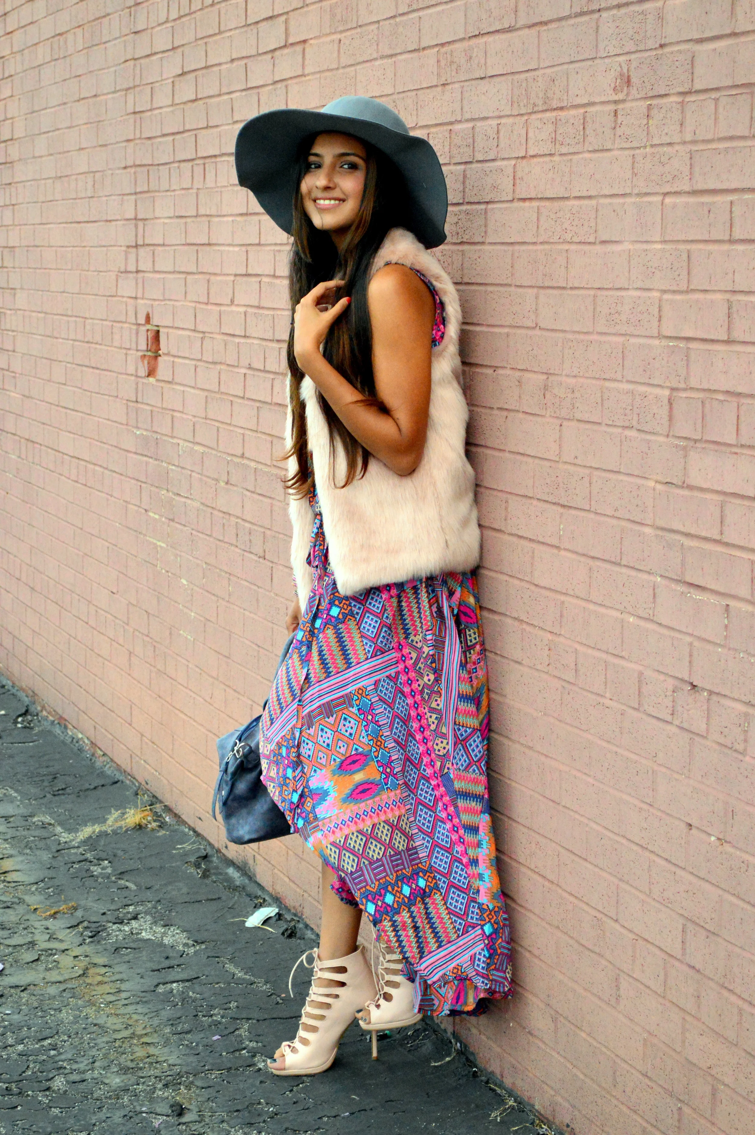 /Back home after a week in Chi-town and there's something to be said for the joy of being reunited with K, binge watching Netflix from my very own couch and a microwave at close range to heat up as many mugs of apple cider as I like. Therefore, currently, my smiles rival the ones in today's post, which were taken on a happy day when I wore one of my most favorite recent outfits and twirled about against a pink wall. I get brownie points for styling bright prints, pastel faux fur and grey suede accessories into one single outfit, right? :) With the combination of a slight breeze in the air and a dress that moves like a dream, you know there was bound to be less walking than swaying/gliding/floating/twirling/dancing. ;)