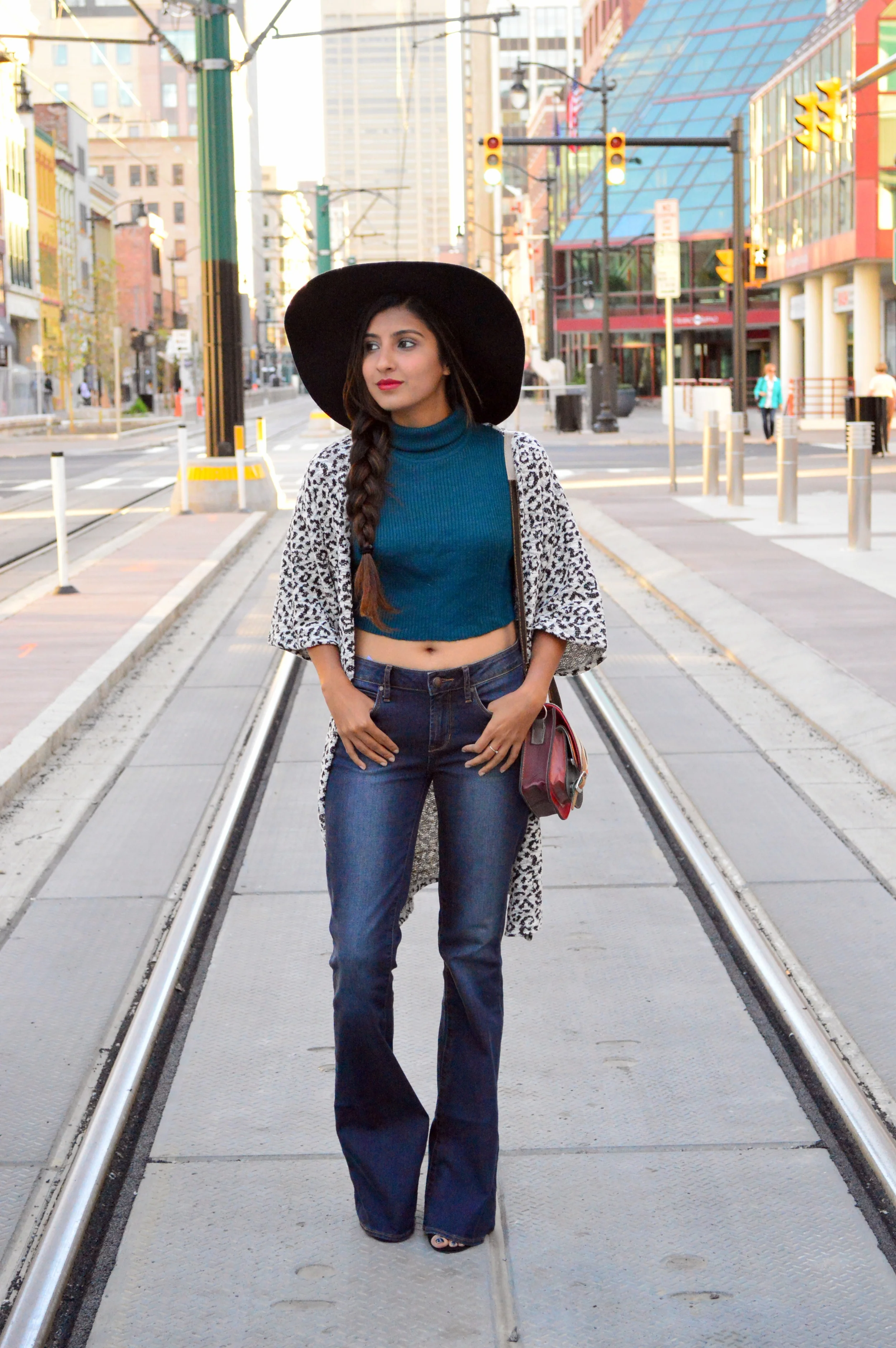 /Floppy hat, chunky braid, flared jeans.. you're thinking what I'm thinking. I'm a walking country song. While my own musical tastes lie more in the classic rock genre, I have to admit that every once in a while, my inner country child needs to be embraced.. in a way that does not involve cowgirl boots, of course. Call me opinionated, but those made me wince even in a Taylor Swift video. And that never happens. #TayTayforever Okay, so I cheat on rock every so often, but there's more of a message hidden in today's look than random musical ramblings.. a message of proportion play. Being petite, it's tricky to love flared jeans and longline cardigans as much as I do, even more so together in one outfit! They're both on point for the season, but if not balanced together, can look very wrong on a small frame. Enter the crop top- a turtleneck crop top for the winter, to be precise. The short of it balances the long of the cardigan, and the fitted-ness of it balances the flare of the jeans. End result: still petite, just more boho-country-ish. :)