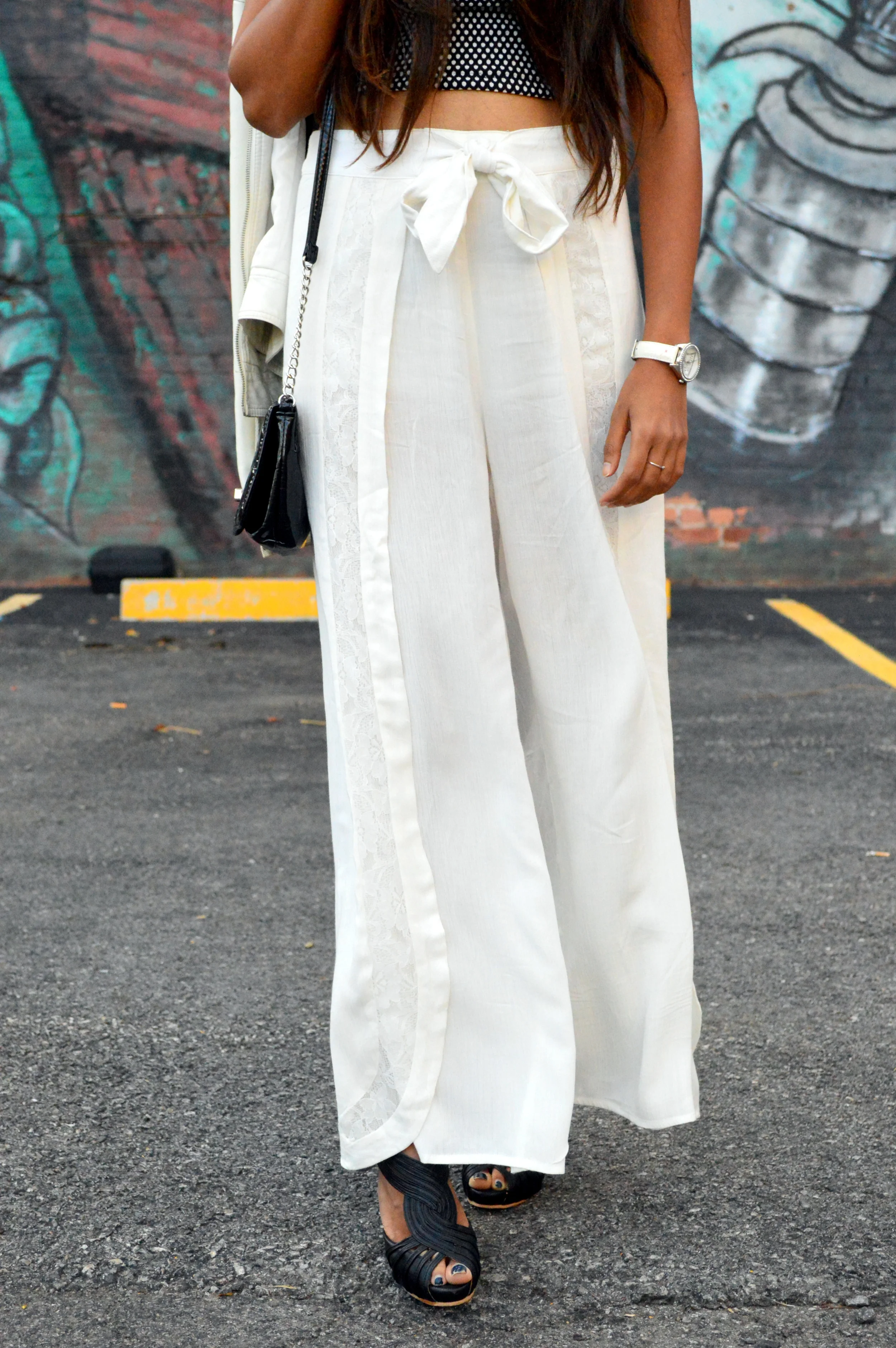 Wide-legged pants have been on my radar for a while now since the comeback of all of the retro 70s vibes, but I just couldn't find a pair that wasn't either too long or too wide on my petite frame. Enter this white pair from Mint Julep Boutique (head over to my Instagram to enter a $25 gift card giveaway!).. not only does it fit just the way I like it, the tulip hem, lace panels and bow-tie waist make it a head-turner to say the least! Since we shot these photos during our short Indian summer, I paired the romantic drape of the pants with a fitted crop top and an edgy white moto jacket, but I've since worn the pants with basic sweaters to keep warm. :)