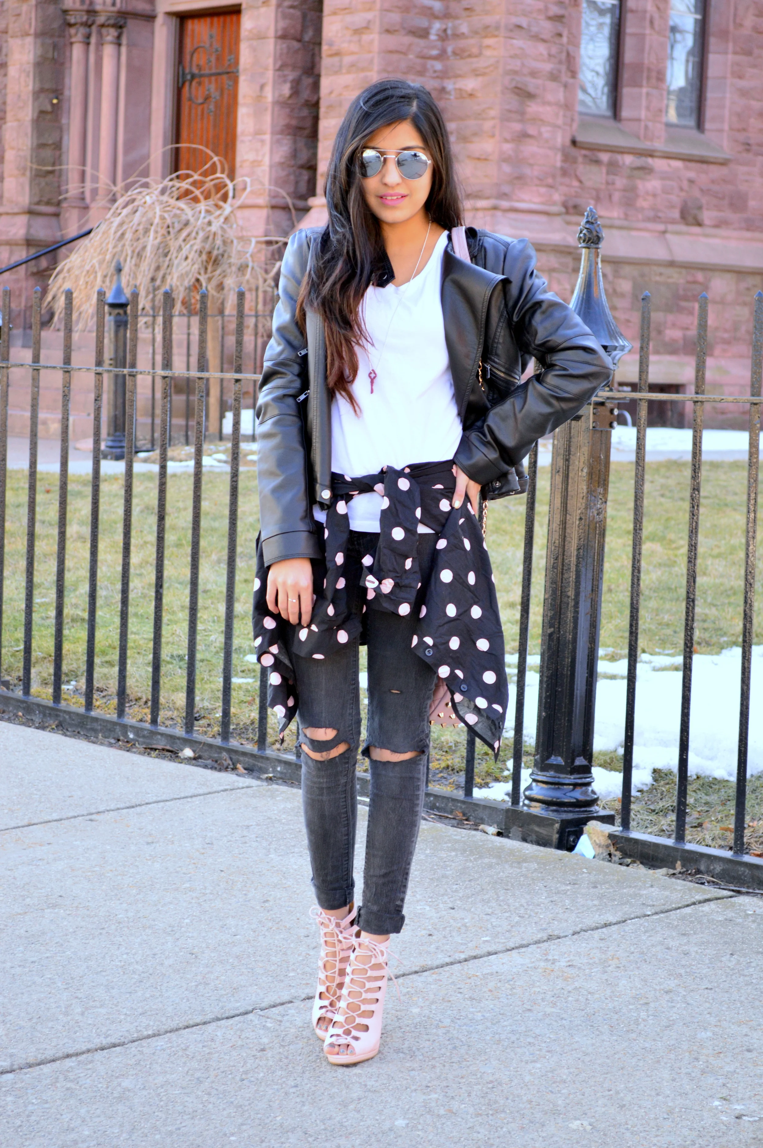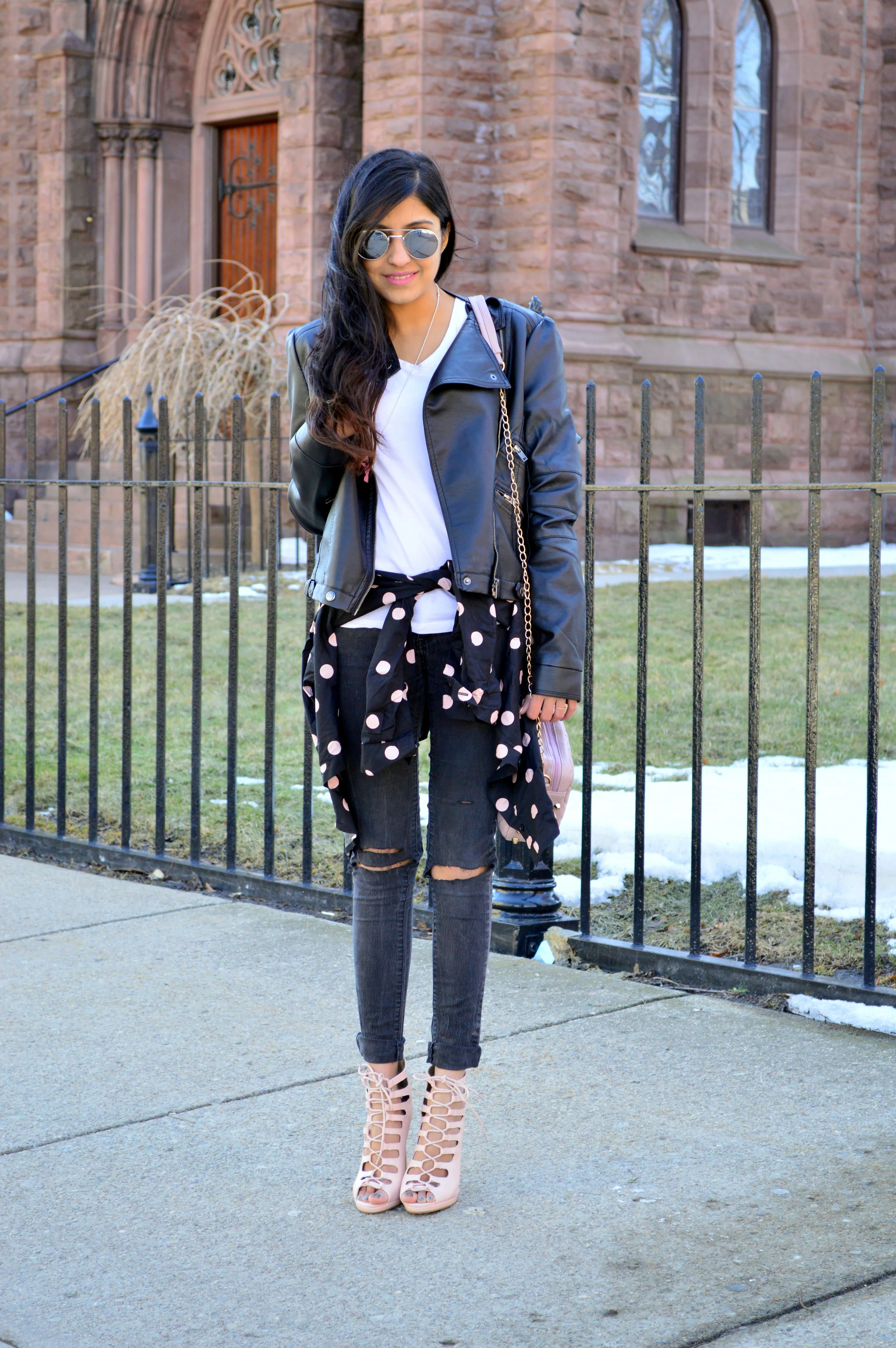 Those of you who do me the kindness of returning to my little fashion diary time and again know that my personal style is mostly feminine, and that I have much love for colors and prints. As funny as it may sound, I sometimes get into a rut with my bright, colorful outfits, which is when I make the effort to step out of my comfort zone into the edgy or boho or whatever other style I haven't had the courage to try in a while. Precisely what happened this past weekend, what with the floral fever that I've been having recently! End result: black and white, (faux) leather, and rips. The 70s trend of everything tied around the waist is a street style rage all over again, you guys! Take my word and try it.. it instantly ups the cool factor!