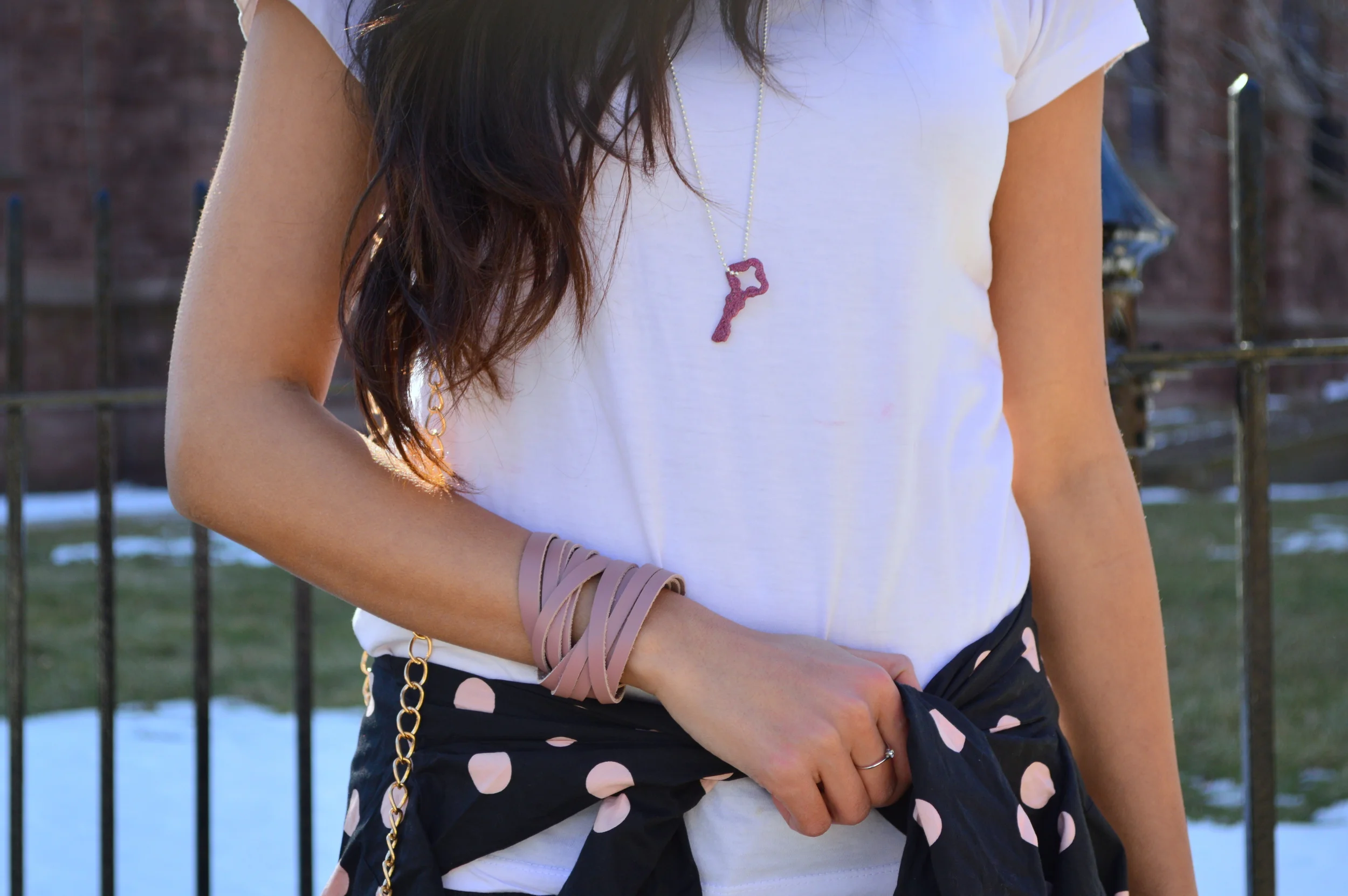 Adding the perfect casual pop of glittery pink is this La Clé Jewelry key necklace. La Clé repurposes old keys into necklaces in any color of your choice. Each color represents certain positive qualities, that the necklace then acts as a reminder for you to embrace. (Pink- Thoughtful & Patient. Thoughful? Yes. Patient? Hmmm. I've got some work to do!) Talk about not just looking good, but feeling good too! Furthermore, the color fades off over time to reveal a 'naked key' that can be used to do good too, because La Clé will make a donation in your honor to a charity of your choice for a picture posted of your #nakedkey story! So many reasons to be a La Clé fan, if you ask me! :)