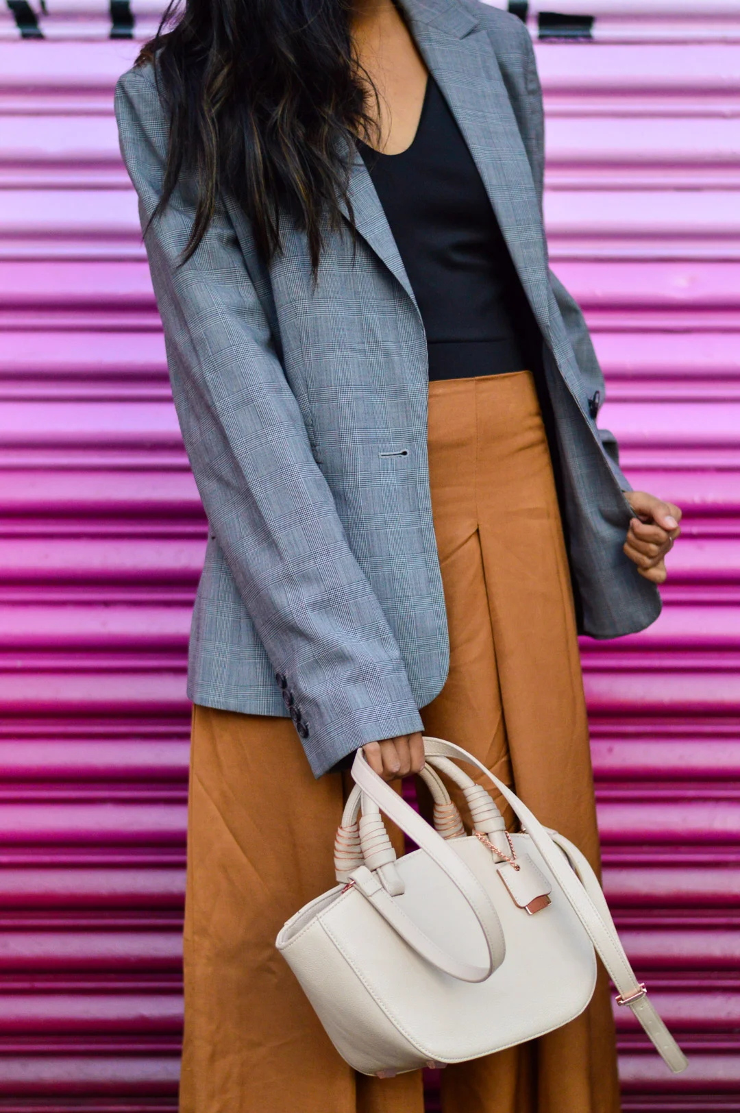 /Didn’t think it at the time I shot these photos, but this post makes me feel sooooo… San Francisco. Wide-legged pants that are a slight trouser-y upgrade from the OG hippie kind, a bodysuit that tricks you too quickly into labeling it as basic until you notice the party in the back (from my new fave UK-based brand!), an oversized glen plaid blazer that is a slightly relaxed version of the one every Instagrammer is wearing this season, the budget (scratch that, they’re a steal!) match to those structured real-antique-gold-hence-unaffordable statement earrings…