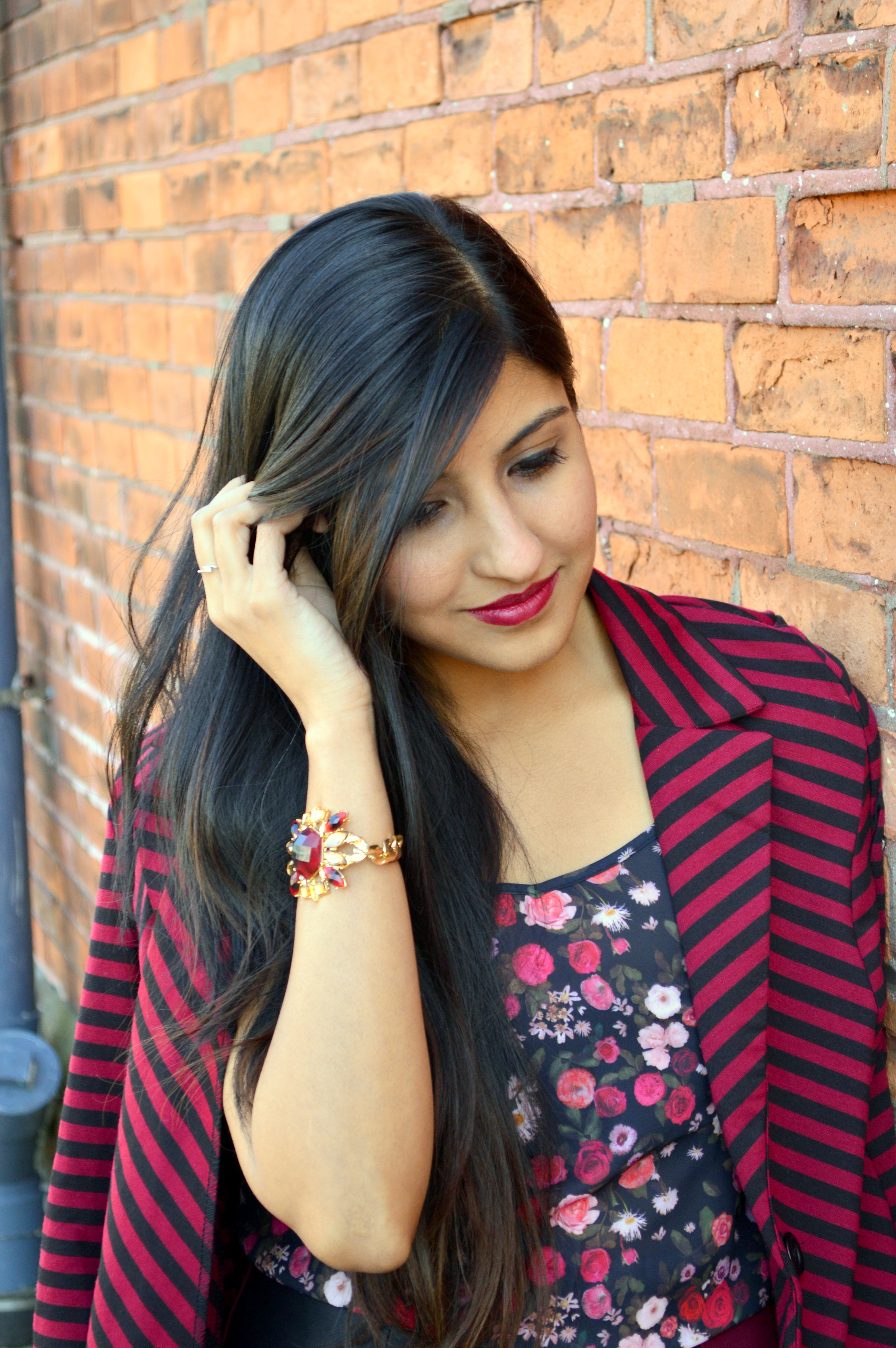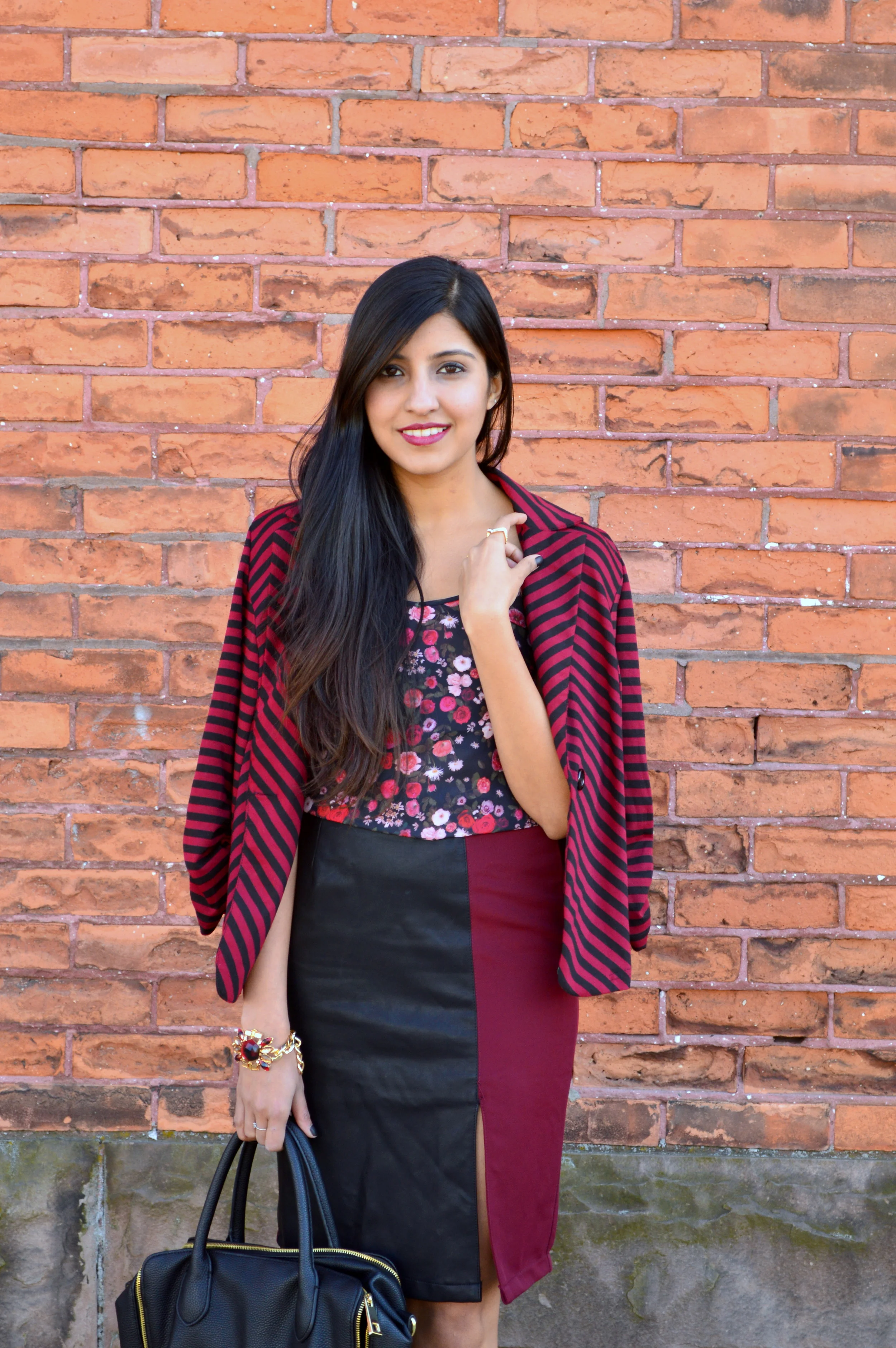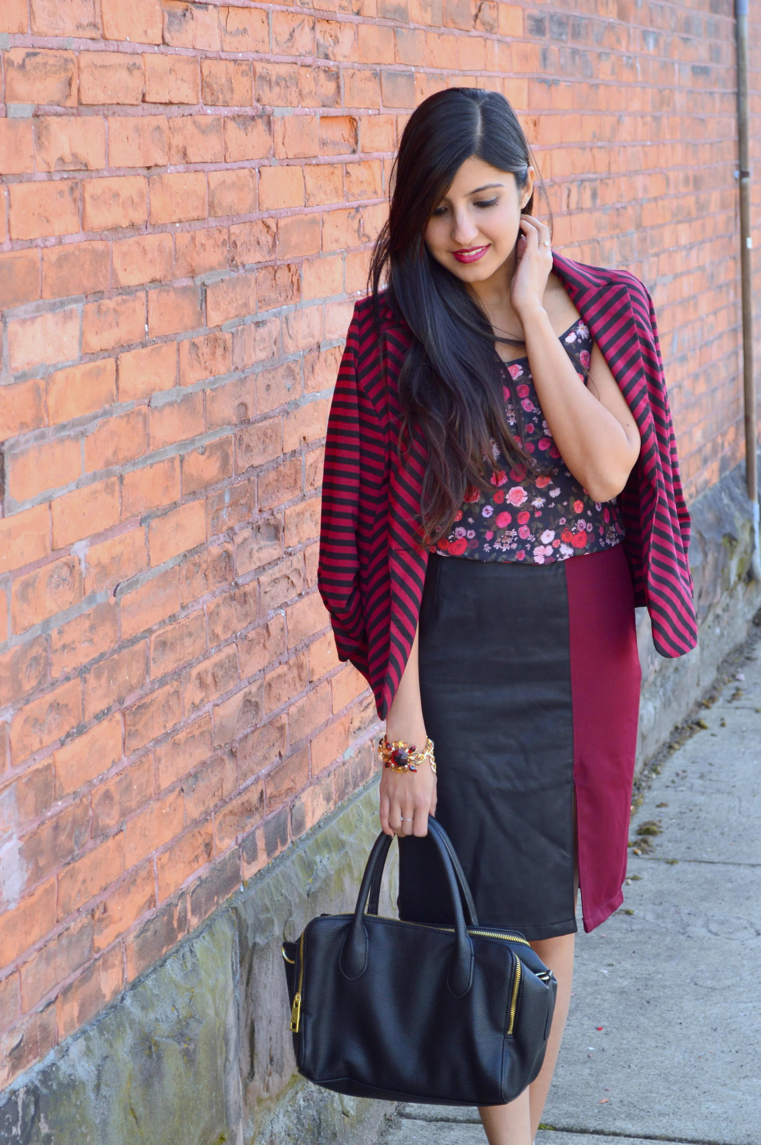 Bringing burgundy back in today's post with a mix of sleek, tailored pieces and a little print-on-print action. A fitted pencil skirt is one of my favorite pieces of clothing due to it's versatility for both work and play, and it took one look at this two-toned, mixed media Moddeals skirt for me to add it to my collection! While it's definitely more suitable for play than work, I love how the thigh slit and the leather paneling subtly up the glam quotient. For a playful daytime look, I paired it with a silky floral tank and a striped, cropped blazer.. but I'm eagerly waiting for summer when I can wear it with a simple black blouse and some gold accessories for the perfect date night outfit.