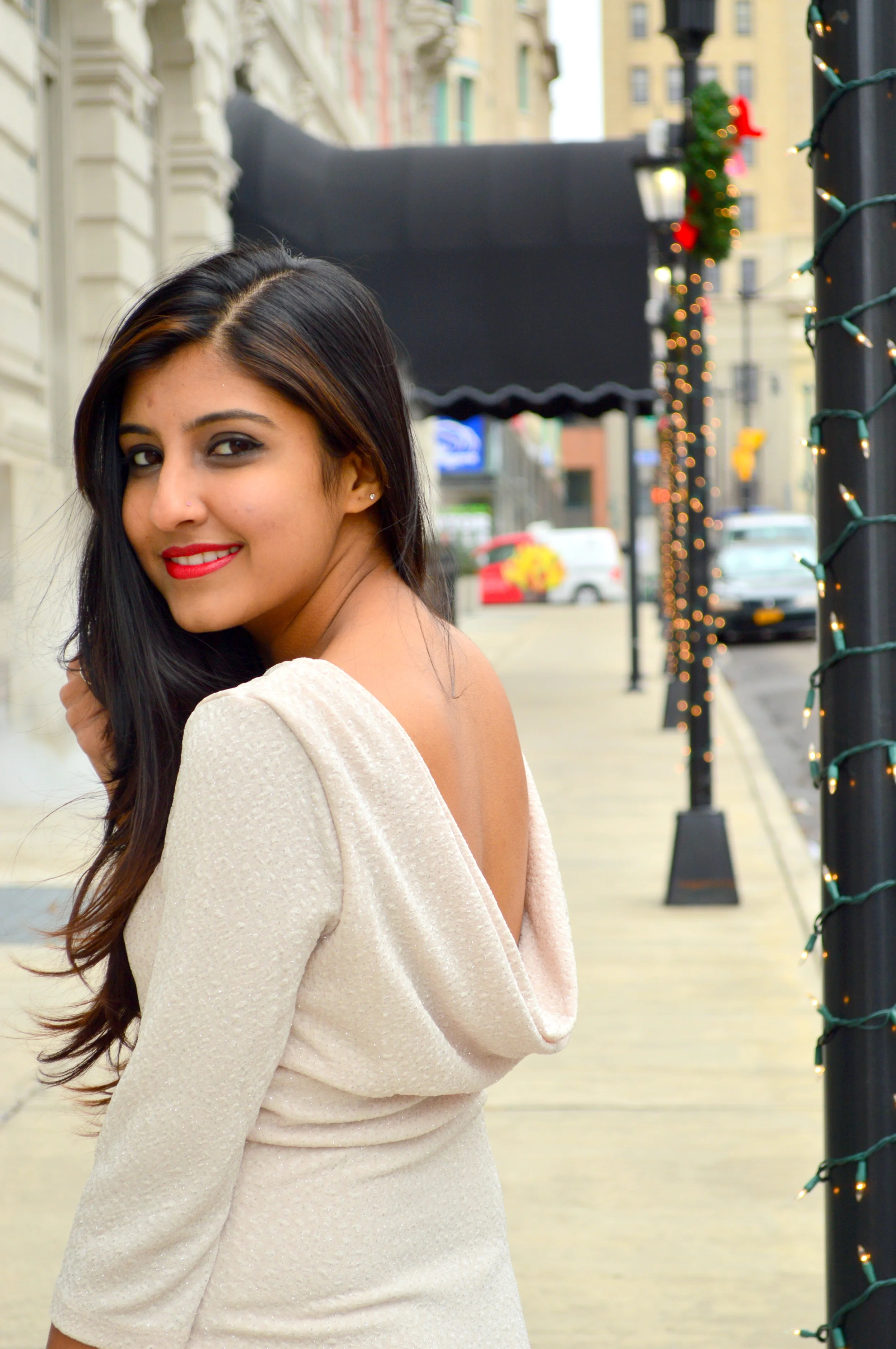 The first of the two party perfect looks involves this subtly sophisticated dress that's business in the front and very party in the back, if you know what I mean. ;) Modesty in dressing has almost become a necessity since moving to cold Buffalo a few years ago, but if there's one occasion when sexy trumps shivers, it's new year's eve! I love myself some classy risqué fashion once in a while to embrace, flaunt, express confidence and all that, and this ivory/nude number fit the bill just right this year. Unfortunately, daylight does not do the dress enough justice.. the textured and self-colored animal print, the subtlest spattering of gold and silver glitter and the draped backless silhouette all had me in love at first sight!