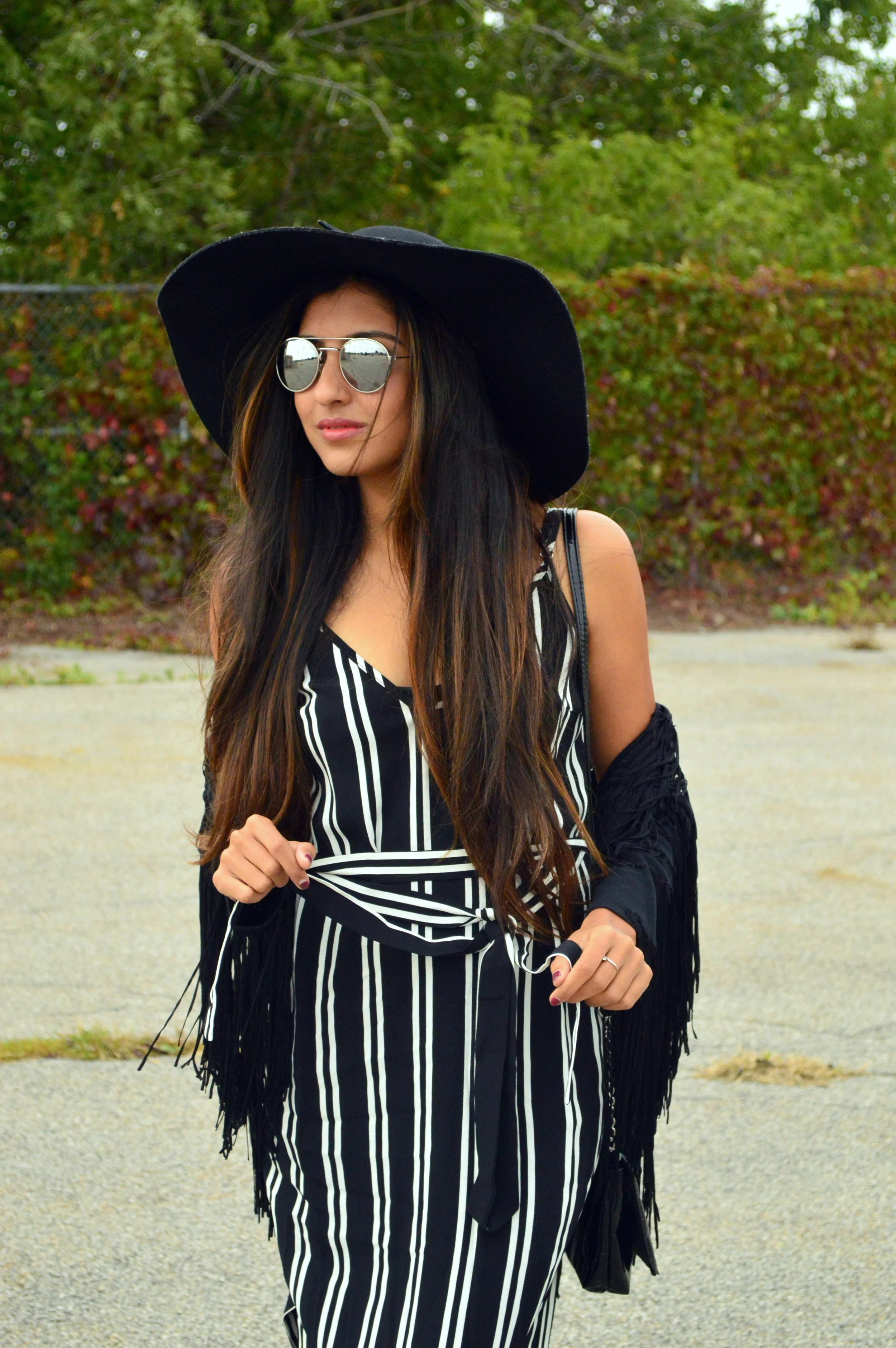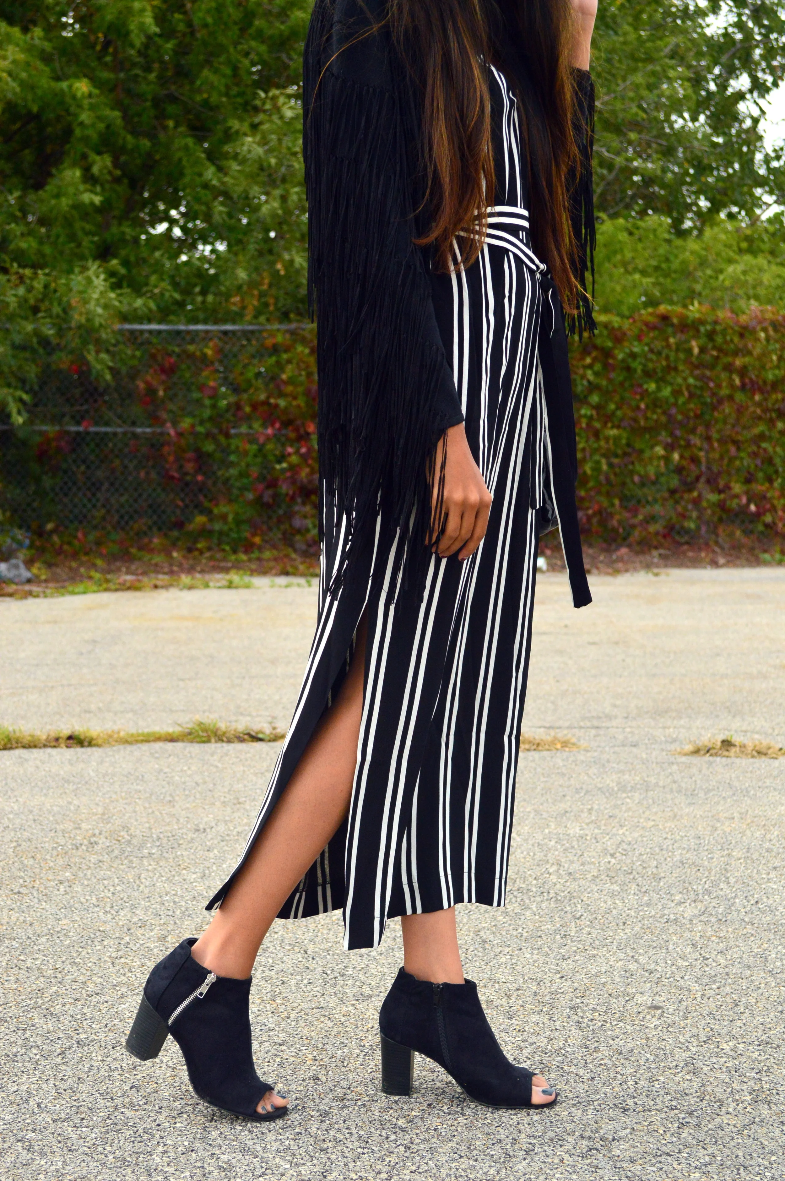 /Even as I'm working on this post, I'm realizing that it's been a minute since I last wore some real color here on the blog. Black and white has been on heavy rotation lately, and for good reason, too.. When pieces as chic as this striped midi dress and fringe cardigan are on hand via Lyon and Post (See this previous post for details), it's hard to notice much else! The movement in this cardigan is something that is seen to be believed.. the fringe was literally dancing in the wind! It was a somewhat balmy day earlier this fall when we shot these photos and I chose to go the bohemian-inspired route with a floppy hat and booties, but it would be easy to layer around either piece if you live in a cold place like I do.