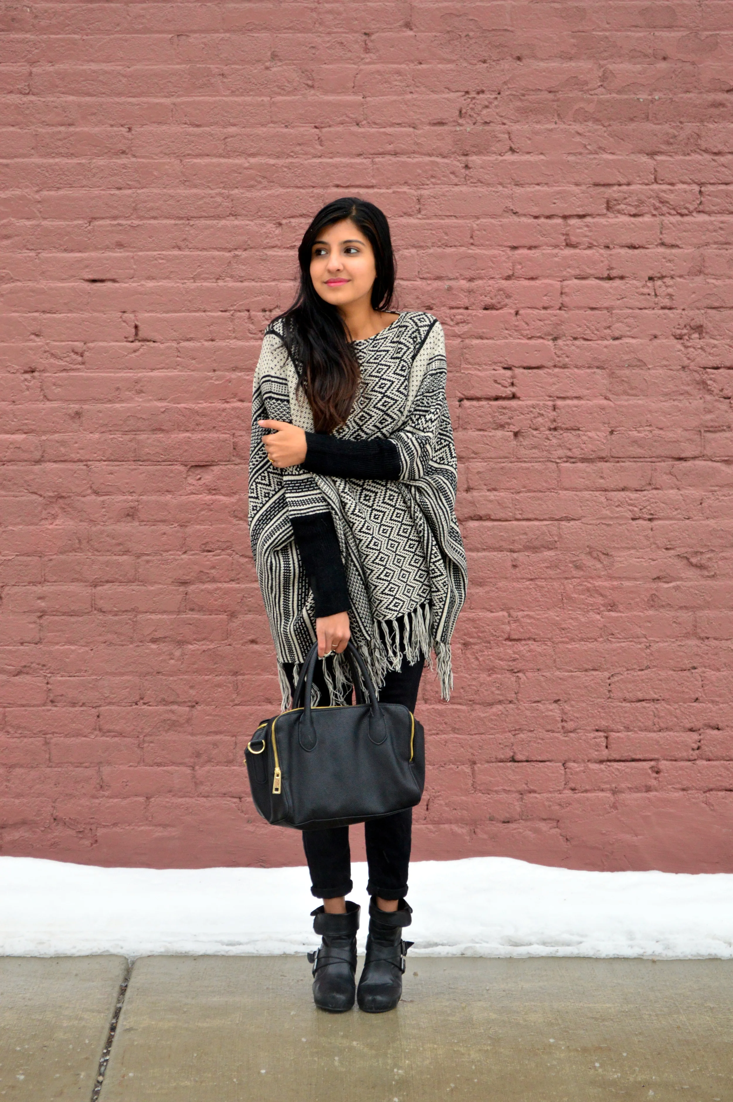 I have an exciting start to February on the blog, as I'm teaming up with one of my favorite online boutiques, Pink Blush, to bring you three fun winter looks this week. Ponchos and Capes have been proclaimed cold-weather staples for a few seasons now, and have made quite the journey from the shapeless blanket-like thingy worn a few generations ago! While my cape is my favorite piece of outerwear in moderately cold weather, I'm finding this knit poncho sweater to be better suited for the bitter cold temperatures this time of the year. The structured sleeves perfectly balance out the roomy poncho styled body of the sweater (Petites, hear hear!), and the tribal print + tasseled hem add an almost boho feel to the outfit. The woolen knit is thick and warm like a cozy blanket.. I was hugging myself the whole time I was wearing it!