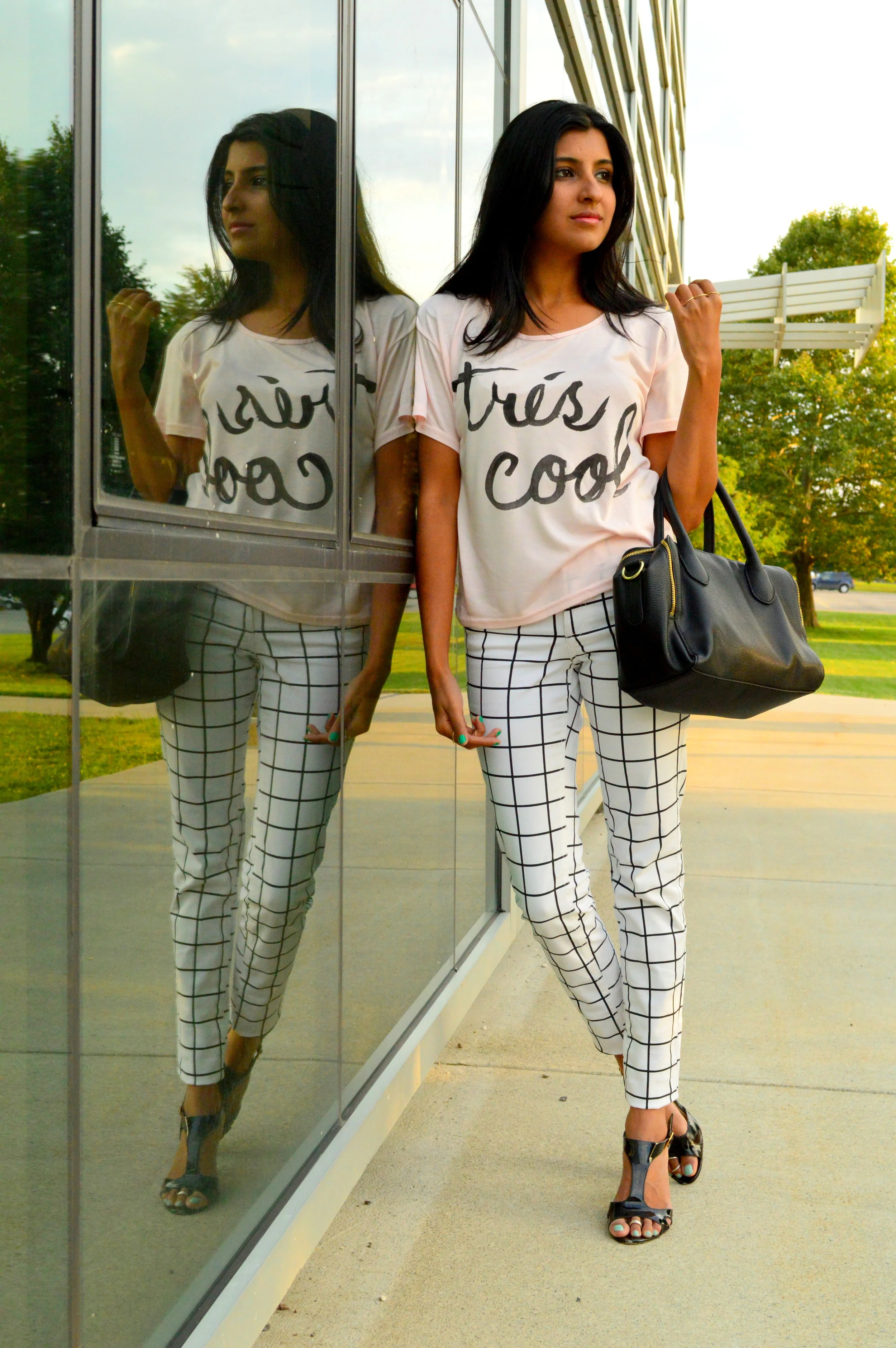 Just as promised in my first summer pants post, I'm talking about Fancy Pants Version 2 today: Printed pants. The idea of anything but the non-existent print of good ol' denim would have received a dismissive head nod from me until about two years ago, when pants of all prints and patterns made their foray onto the style scene. Now, I'm a firm believer that a pair of fun printed pants are a closet staple, as they're most often versatile enough for all seasons. There's something for everyone, be it florals for the feminine, lines or dots for the simple, abstract prints for the free-spirited or even mixed prints for the adventurous. The key is to keep the remaining pieces in the outfit simple and relaxed while letting the print on the pants do the talking. I love the windowpane print on the pants I'm wearing.. Its such a sophisticated take on the usual checked pattern and allows just enough room to play with the rest of the look.