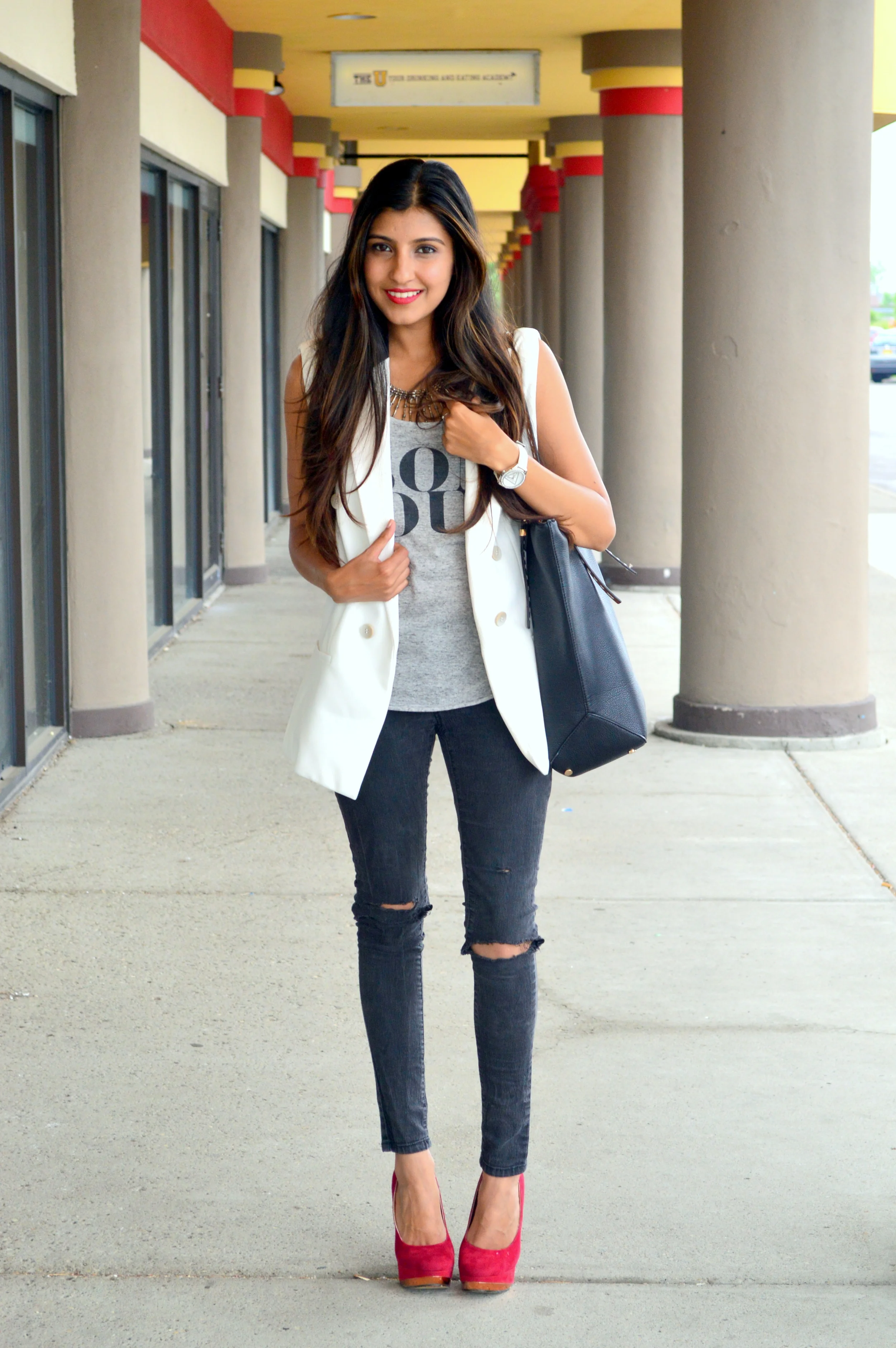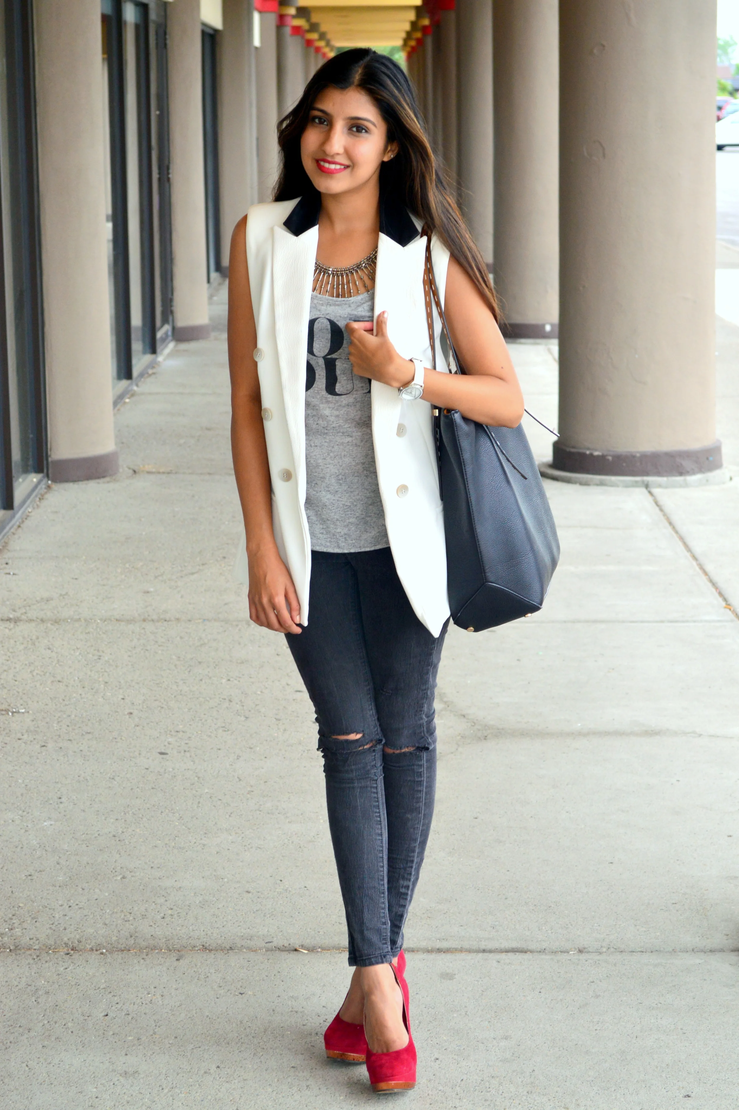 First up on my current it piece crush list is the sleeveless vest. I have to admit that until recently, a vest would bring to mind images of dapper gentlemen with briefcases or 70s woodstock attendees, but the tailored piece of outerwear has been a staple on the fashion scene this season to say the least. It's versatile as a work and play-friendly layer, it's light as a feather on in the heat, and it makes a graphic tee + ripped jeans combo open to compliments from the hubs.. 100/100 if you ask me!