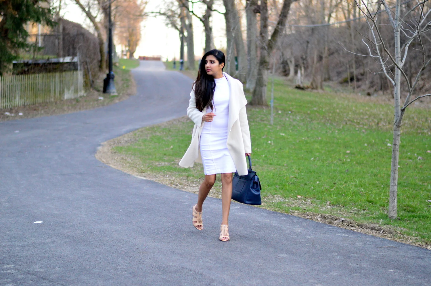 /Colors, prints and I make for an inseparable trio on most days, but like almost everything else in life (Read as: guacamole, rosé and netflix), moderation becomes key every once in a while. ;) Spring happens to be the perfect time to exercise said moderation, what with spring cleaning leading the way to a clean slate and new beginnings and everything, and what else does a clean slate mean in Spring fashion-ology but a good ol' LWD and solid neutrals? This bodycon high-necked update on the basic little white dress is such a great option for work and play, but the party really begins when I tell you that it's made of.. denim! Denim everything is trending this season, and a white denim dress has got to be the coolest way to ride the wave. I opted for an all neutral look with this soft-as-a-cloud fleece drape coat, some seriously chic tasseled nude sandals (so comfy too!) and a pop of color with my go-to navy bag. I don't look like I'm missing my colors and prints too much now, am I? ;)