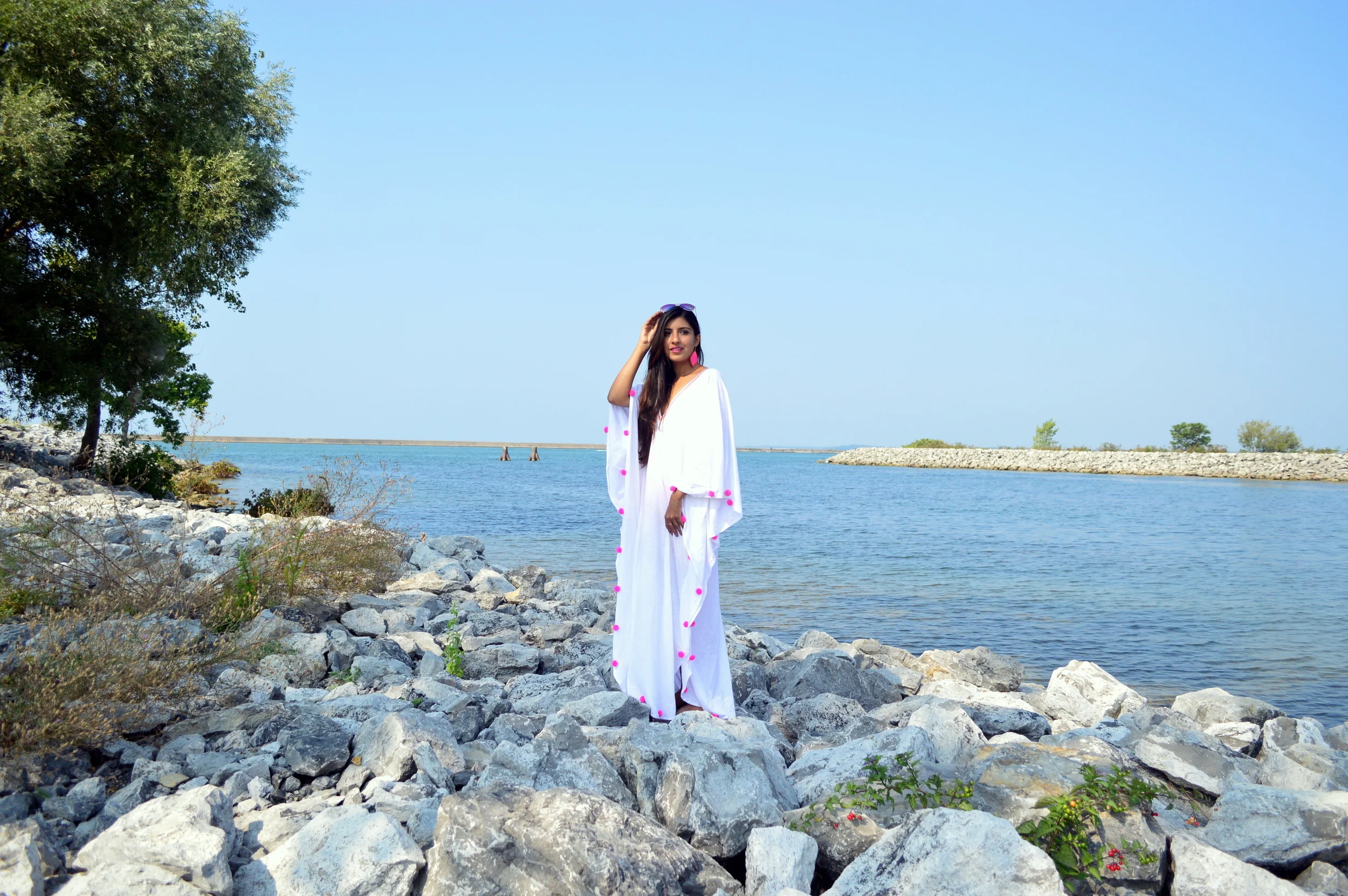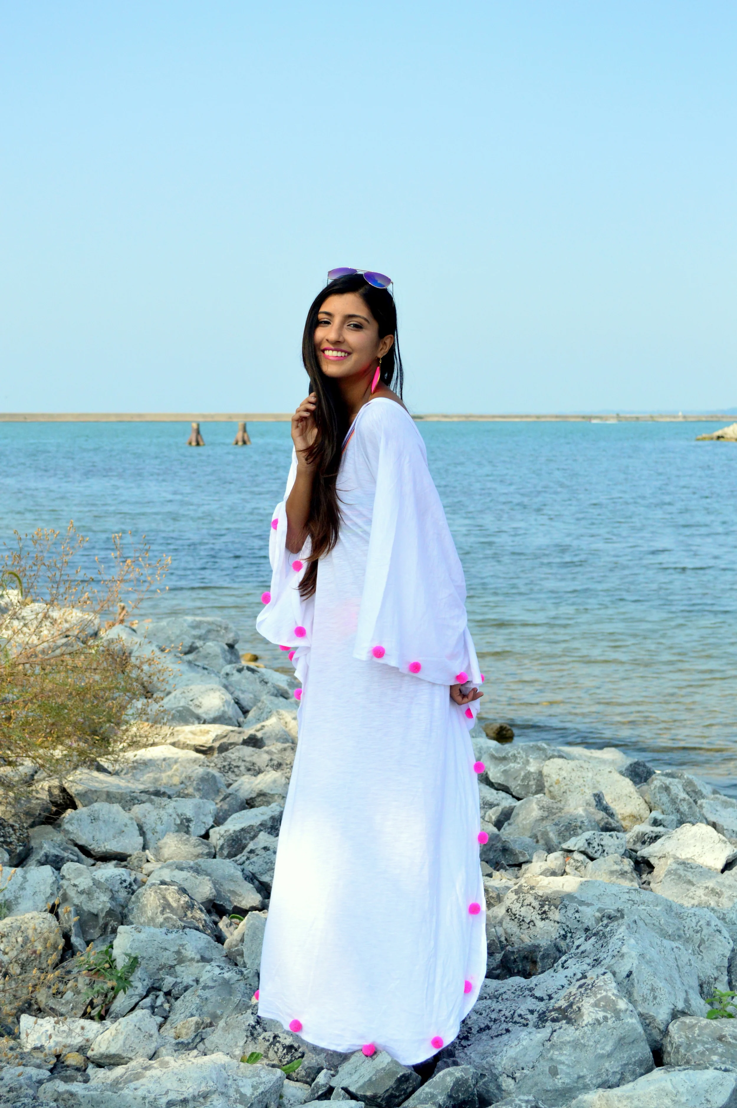 /Thursday night's being real productive after an exhausting day (and week!), you guys. Try as I might to sit up straight, be efficient and write the hell out of this blog post, I'm watching my body slowly and involuntarily collapse under the covers even as I write this, so I have a sneaky feeling our conversation today will have to be short. Not so short that I don't tell you about this Pitusa cover-up though, because that would just be unfair! I love this kaftan maxi cover-up for so many reasons- the pom-pom trim, the breezy silhouette, the light-as-air cotton fabric and the list goes on, but most importantly, I love that one of the most modest pieces of clothing in my entire closet works so great as a swim cover-up on a hot day at the beach. We've been making the most of the Indian summer we've been having by heading to the water every chance we get, and this dress was the perfect piece to carry me through the day. Barefoot and beautiful blues in every direction I look.. what else does a girl need? :)