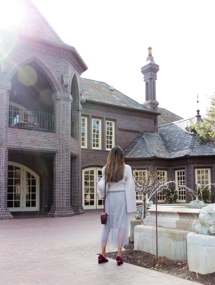 After some amount of indecisiveness over breakfast, we finally picked two in reasonable vicinity to Healdsburg that didn’t require reservations and made the short drive to Ledson Winery in the village of Kenwood. If you’re looking for princess vibes in a castle straight out of a fairytale set in Southern France, this is the stop for you! The grounds are beautiful, the castle is dreamy, the wine is strong… what else can a girl and her Instagram husband ask for? ;) I dressed for the occasion in this pretty embellished tulle skirt, a muted statement piece in a monochrome grey look with pops of burgundy. It was sadly a cold and windy day and we couldn’t take advantage of the full property, but I couldn’t help sneaking outside to catch the dreamy flow of the skirt!