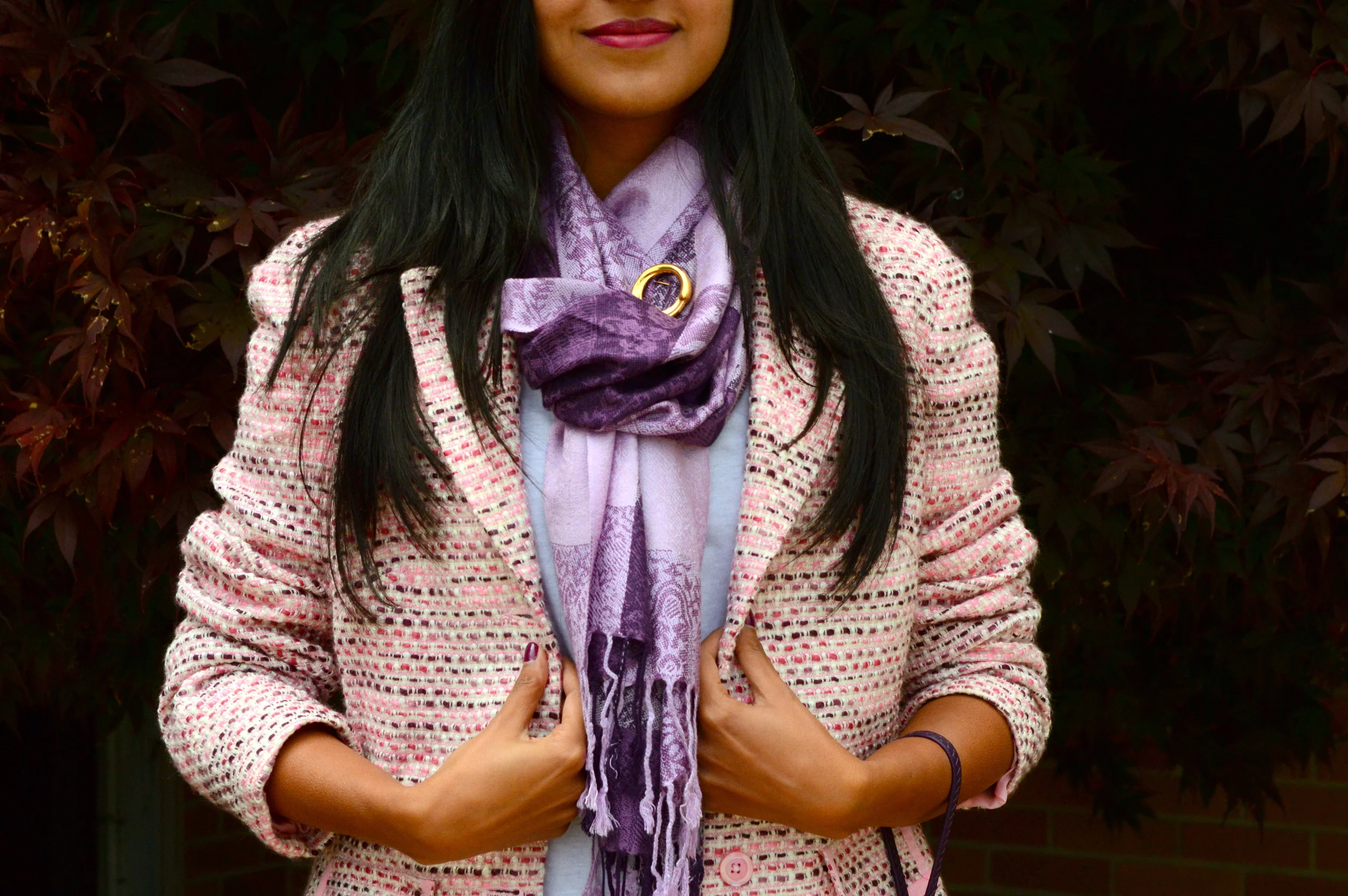 This color combination of aubergine and berry pink is one of my favorites in the fall! I love the more traditional, serious tweed in neutral colors that reminds me of Chanel and preppy yesteryears, but I treasure this thrift find for the refreshing, feminine change that the pink-purple tweed brings. I added a gold brooch as a scarf pin for just a touch of that Chanel-esque charm. :)